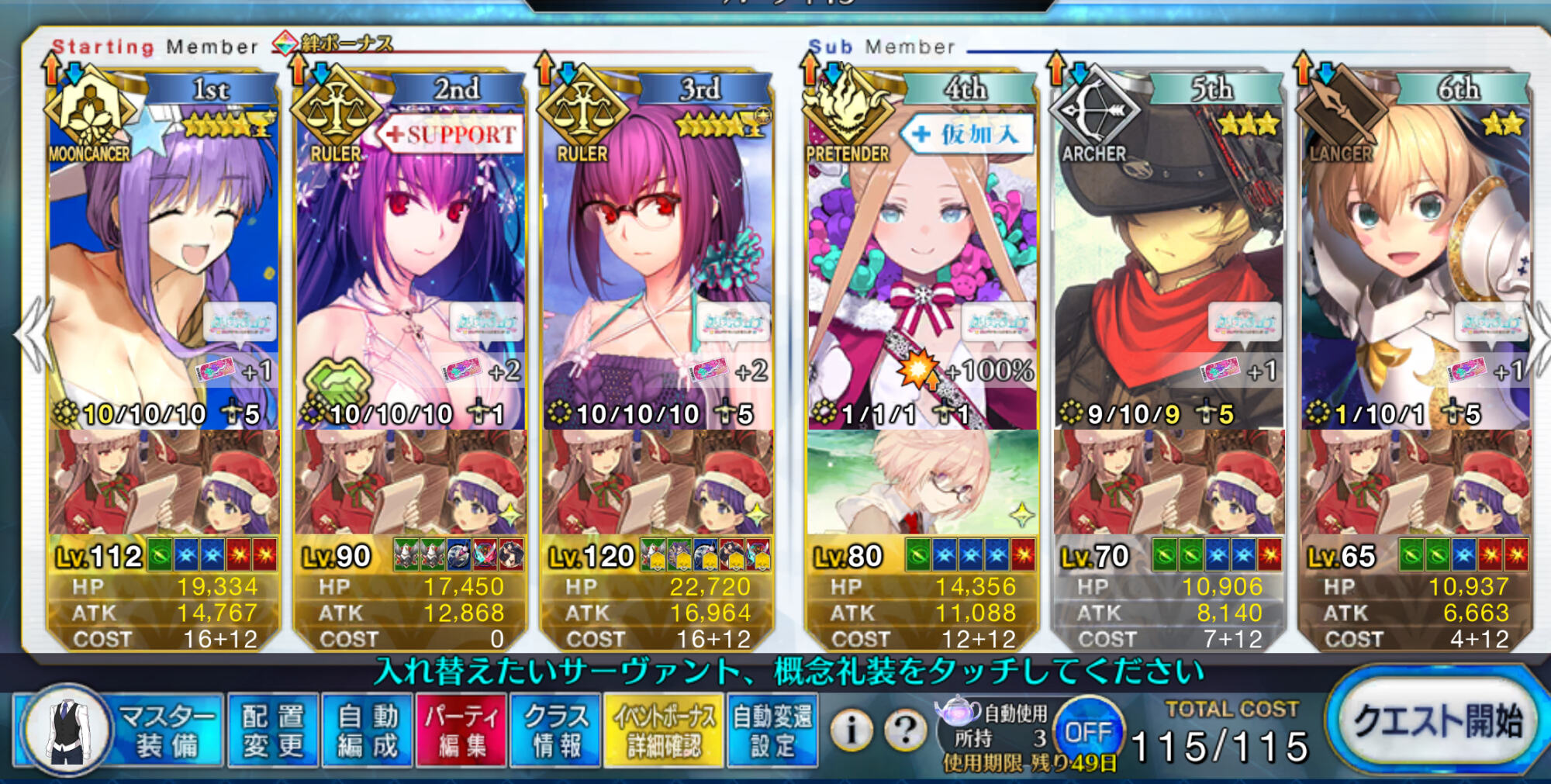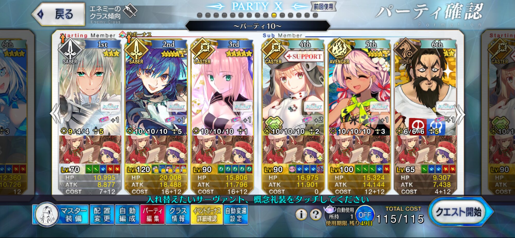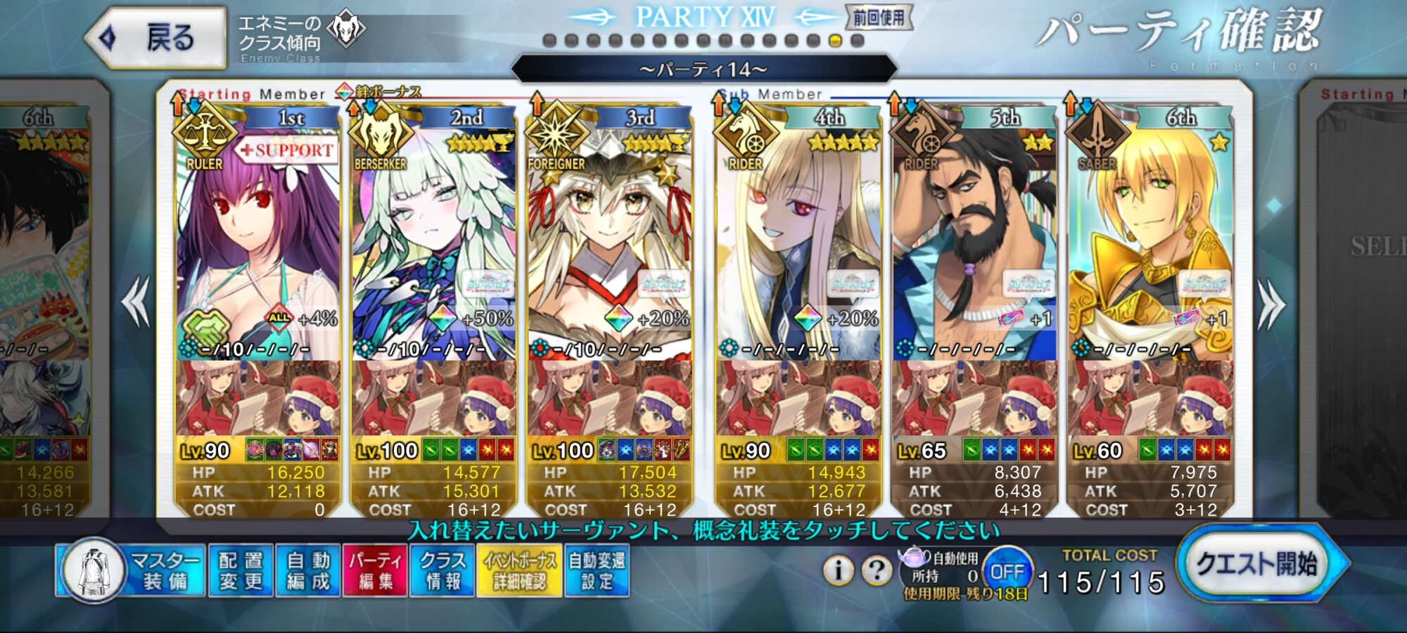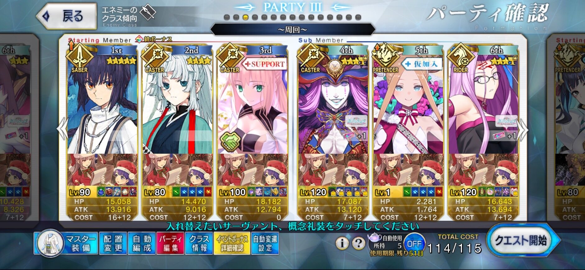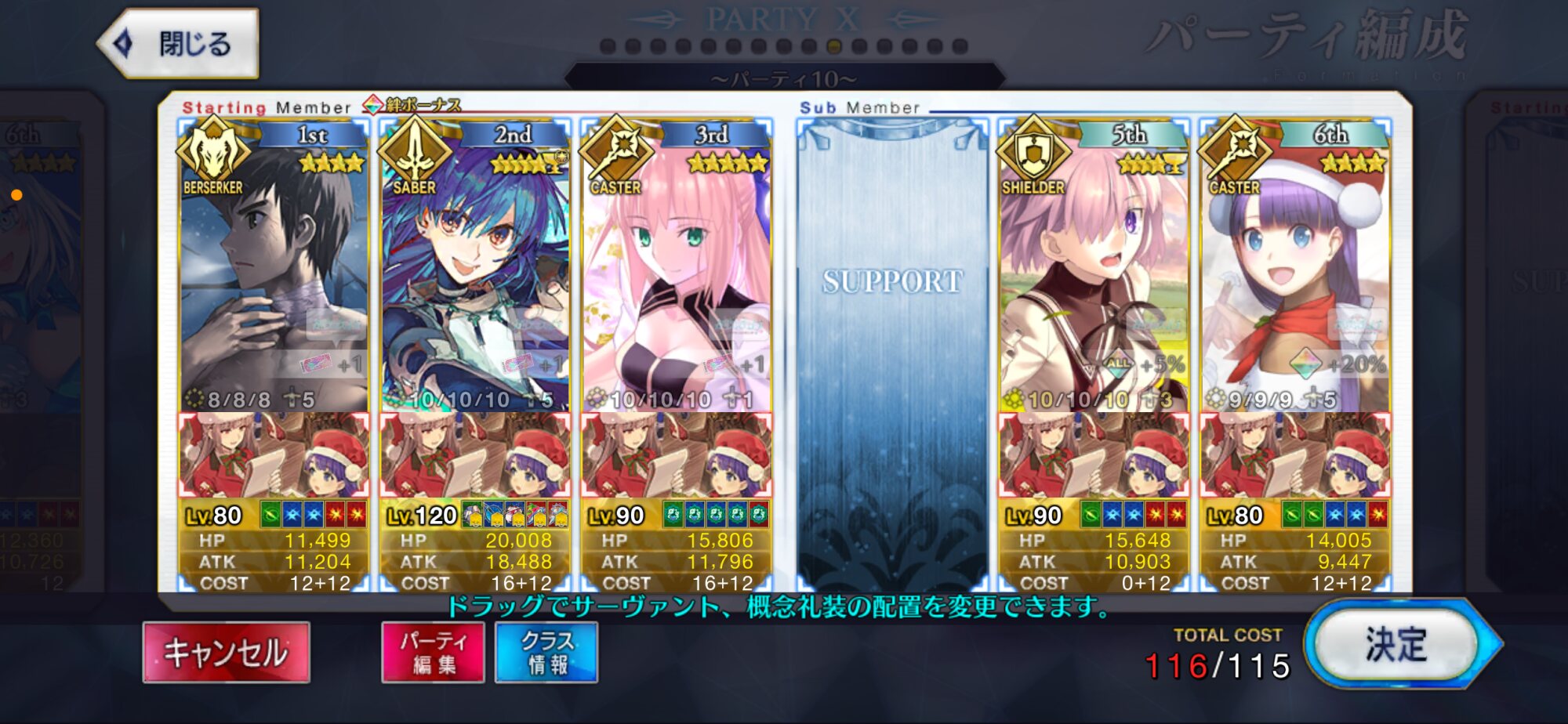 前衛のコストを抑えたくて色々と試行錯誤した結果、キャストリア&ベディヴィエール(アペ2解放のみ)&姫君(アペ2LvMax)となった。