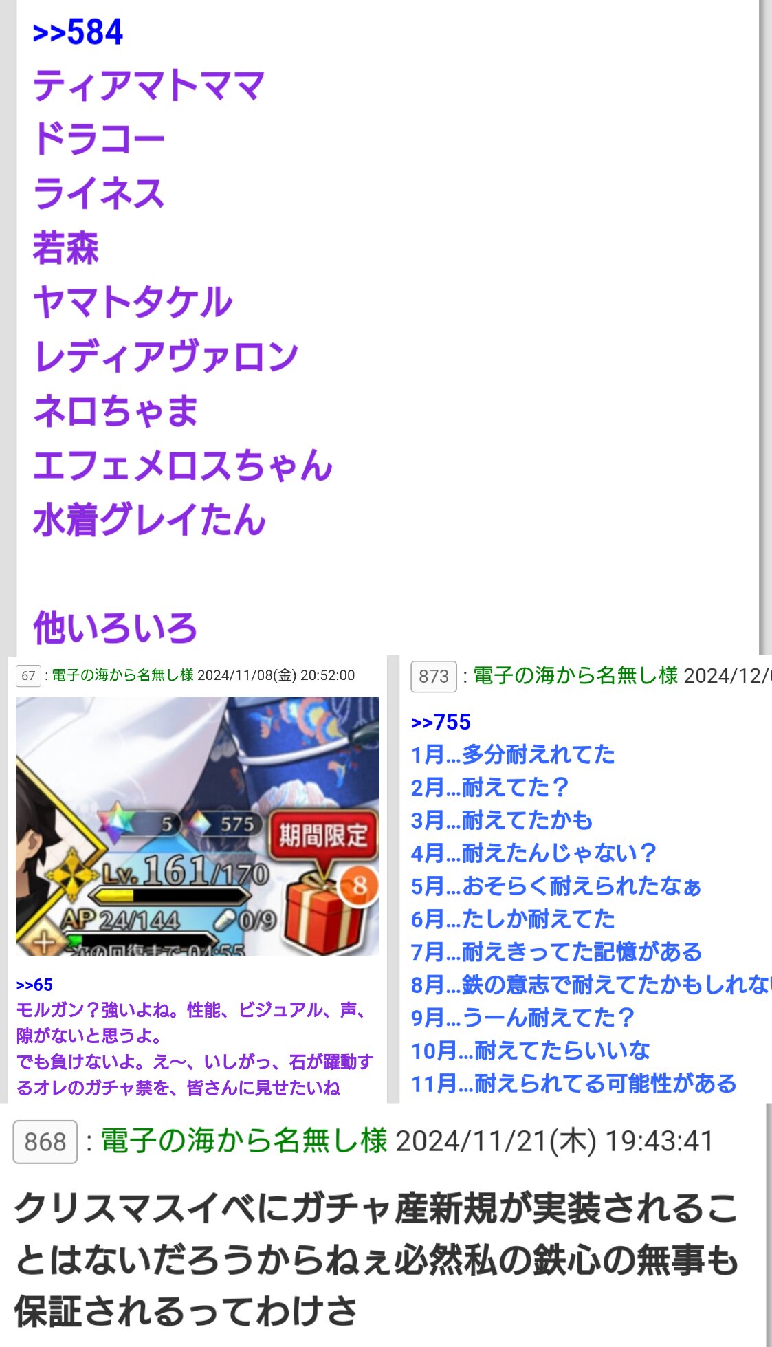 R18関連話題、よくてよ無しのガチャ結果、実装から二週間以内のシナリオ及び開催期間中のイベント内容、進行度依存の報酬、最終再臨や霊衣解放の画像や話題は専用スレにてお願いします。