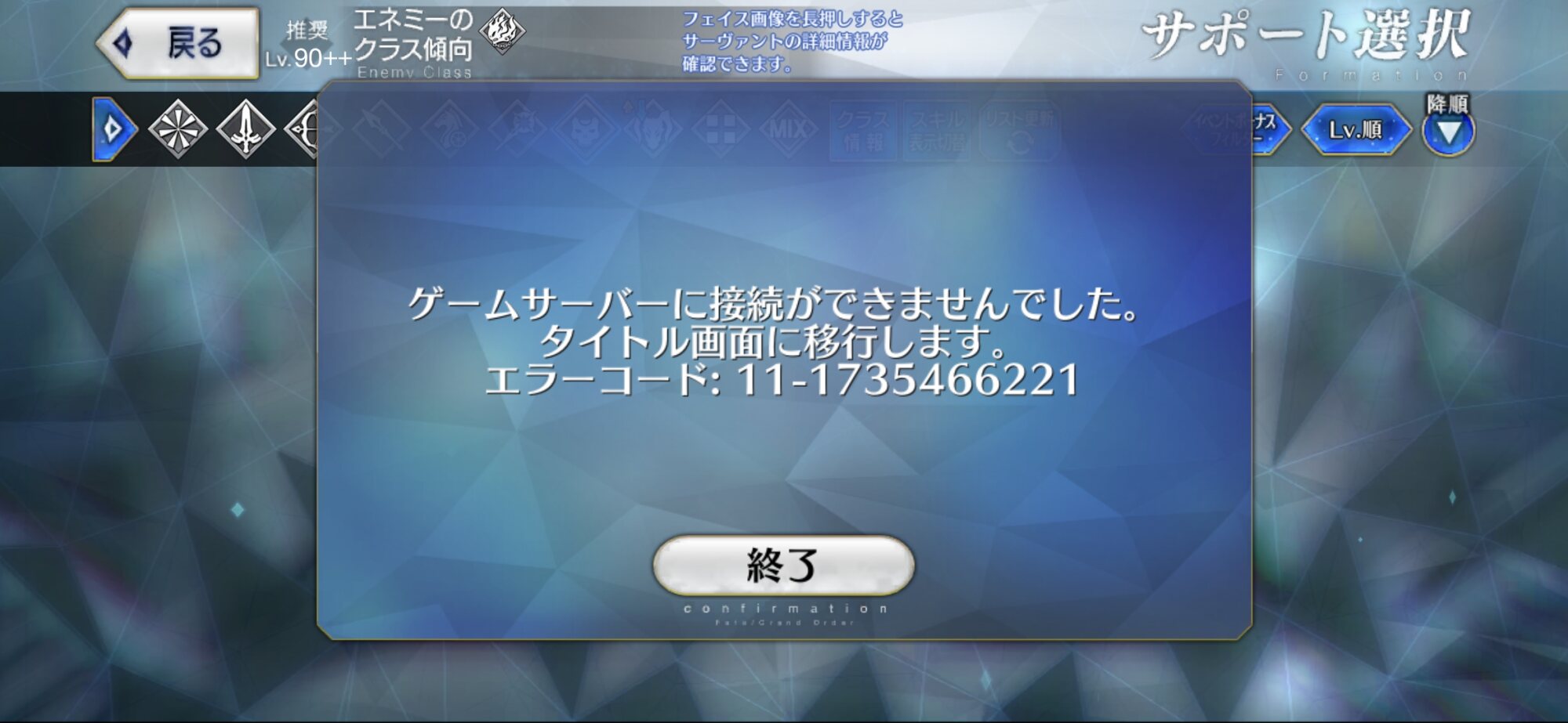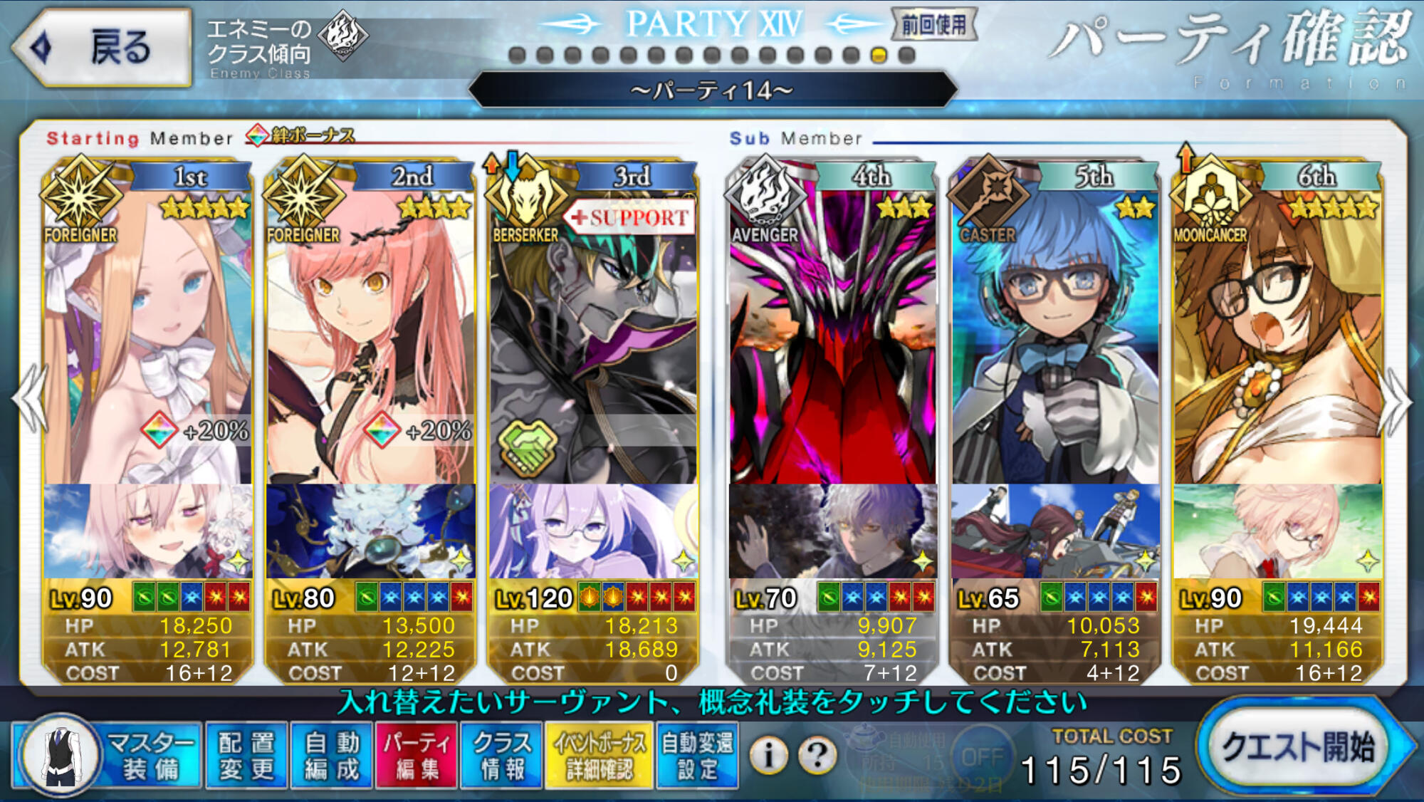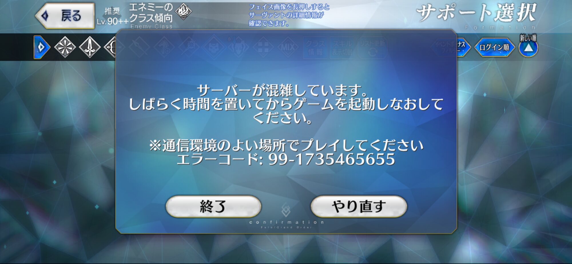 あたりまえだけど90++は難易度高いからねえ、難易度落としたりいっそフレンドからアタッカー借りるのも選択肢ではある。ロード時間のほうが長いから宝具ワンパンとか狙って編成制限するより戦闘時間自体を縮小するより殴り入れても絆とかアイテム優先する方がよさっそうね