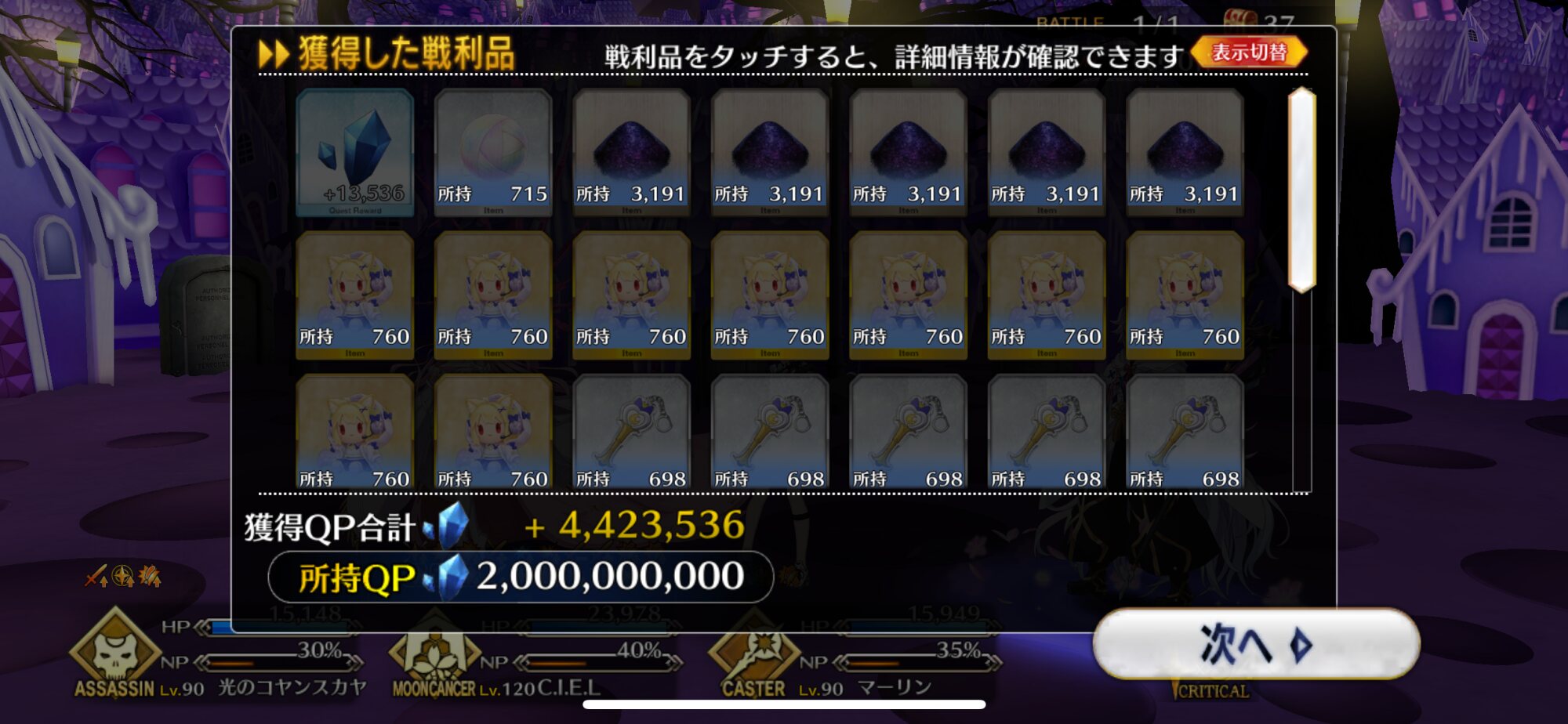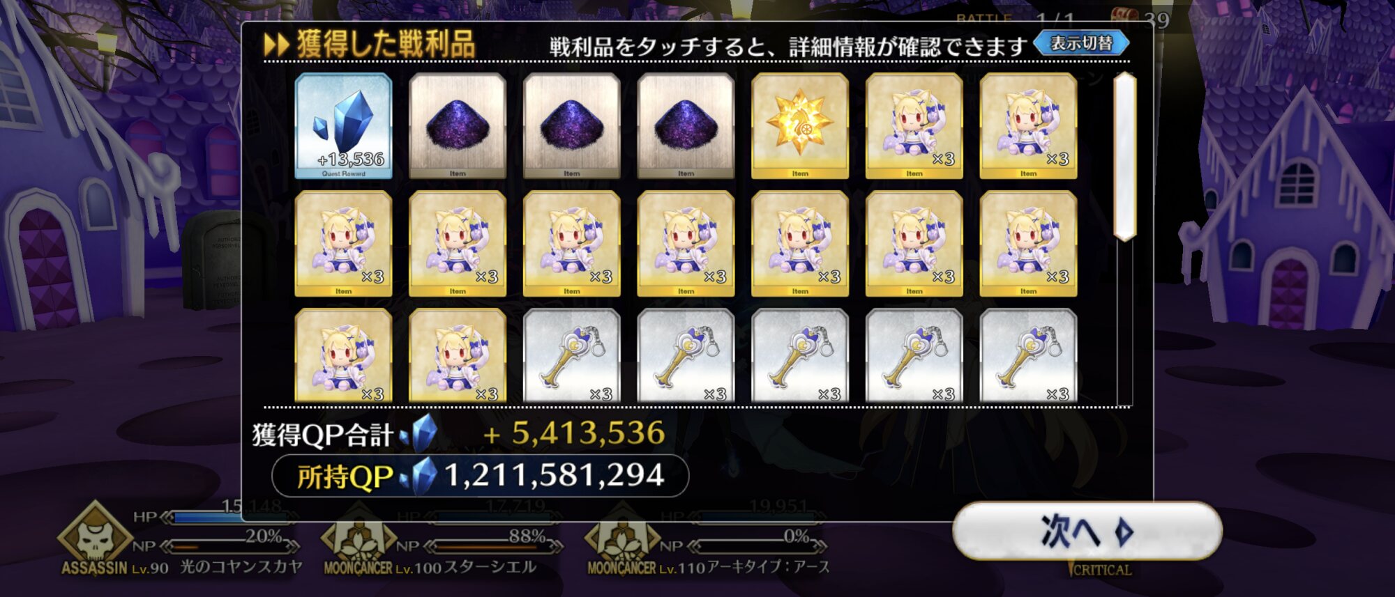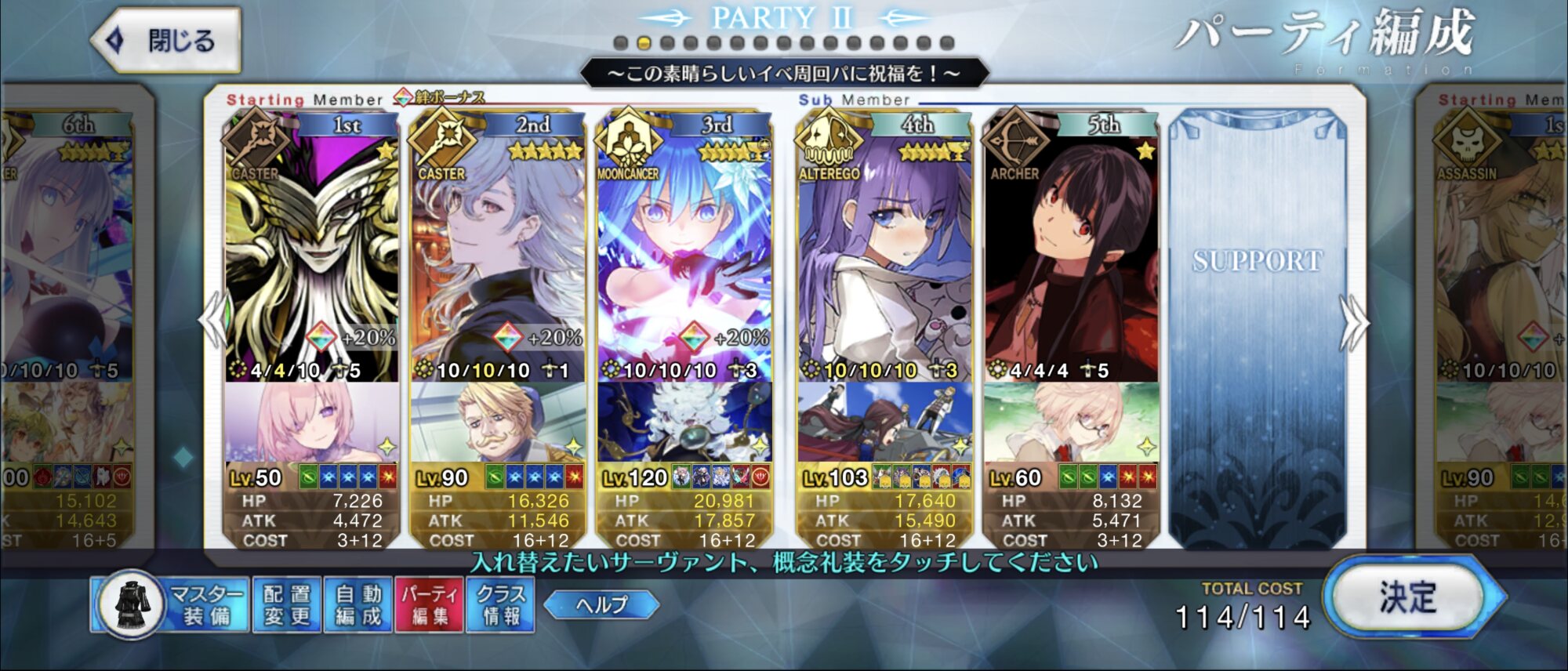 あたりまえだけど90++は難易度高いからねえ、難易度落としたりいっそフレンドからアタッカー借りるのも選択肢ではある。ロード時間のほうが長いから宝具ワンパンとか狙って編成制限するより戦闘時間自体を縮小するより殴り入れても絆とかアイテム優先する方がよさっそうね