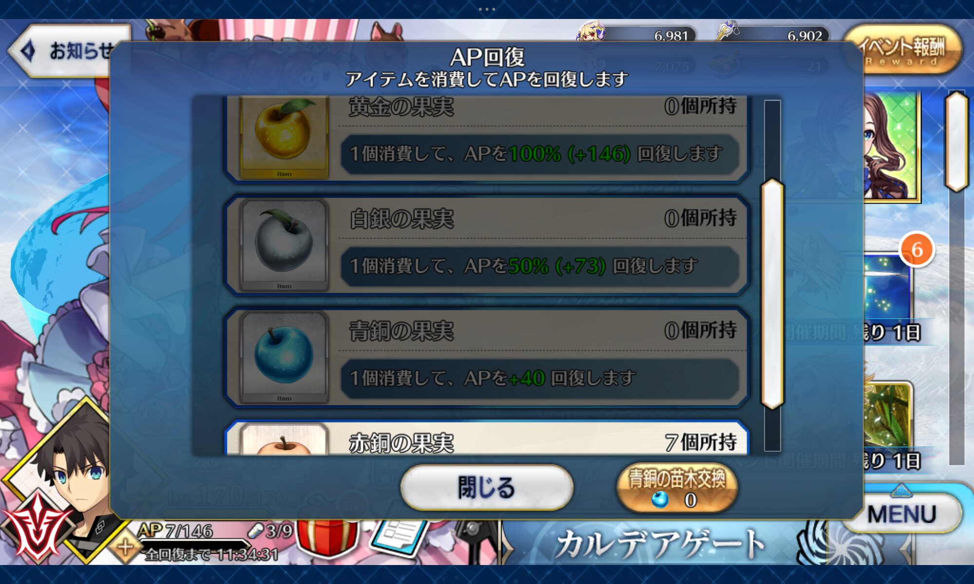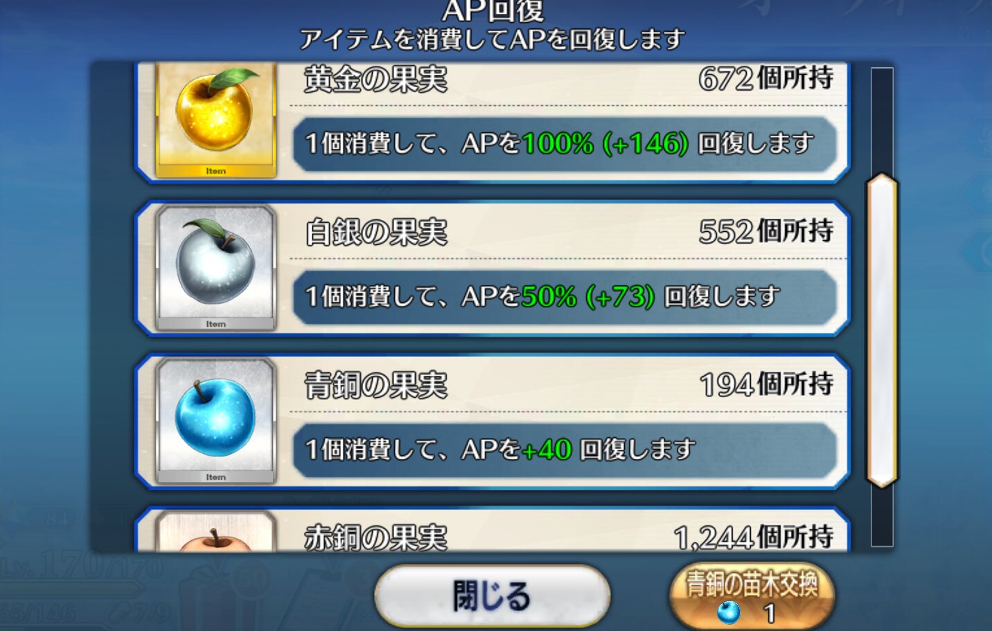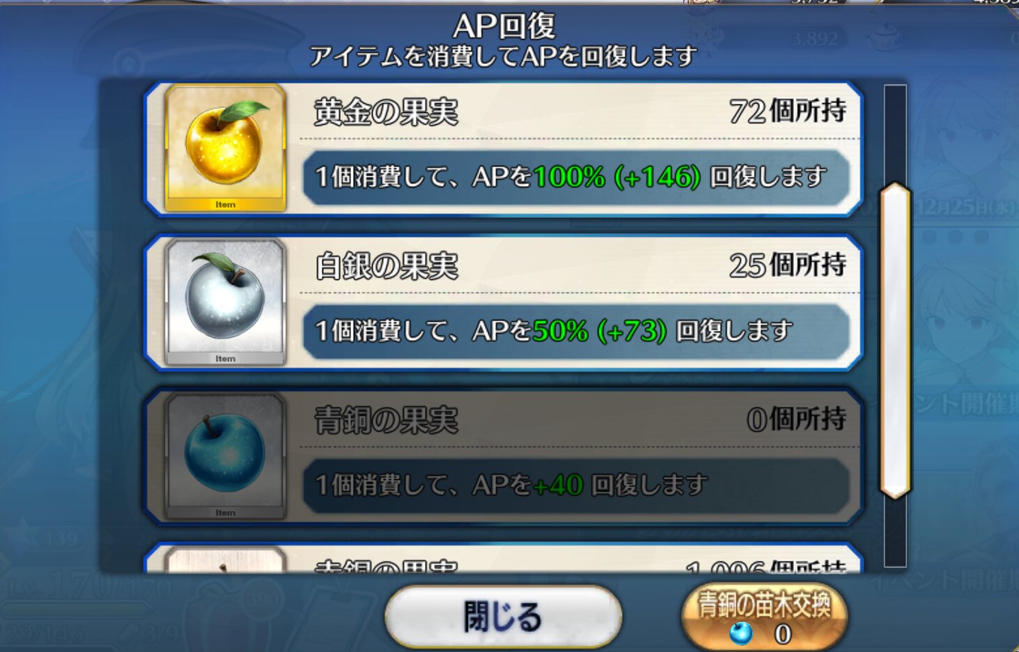 もったいない。初期勢かつ周回ほどほど勢の私のリンゴはまだ四桁あるぞ!