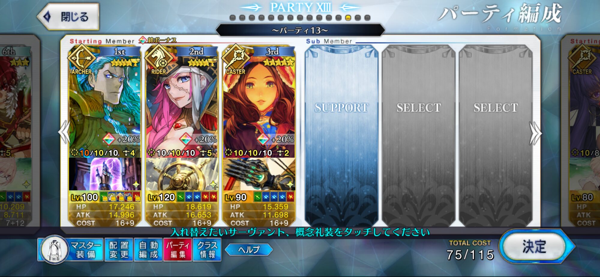 こんな感じです。グランドムーンキャンサーシエルになる人は多そうな予感はしている、絆で宝具30%上昇に毎ターンNP獲得5とHP500回復、そこに看板娘も併用できるとそれだけで3ターンは攻撃80%に宝具使うときはそこに最低でも60%のバフが乗るようになるうえにまだ自前でクリバフと色バフもあるとか結構無法なことになる