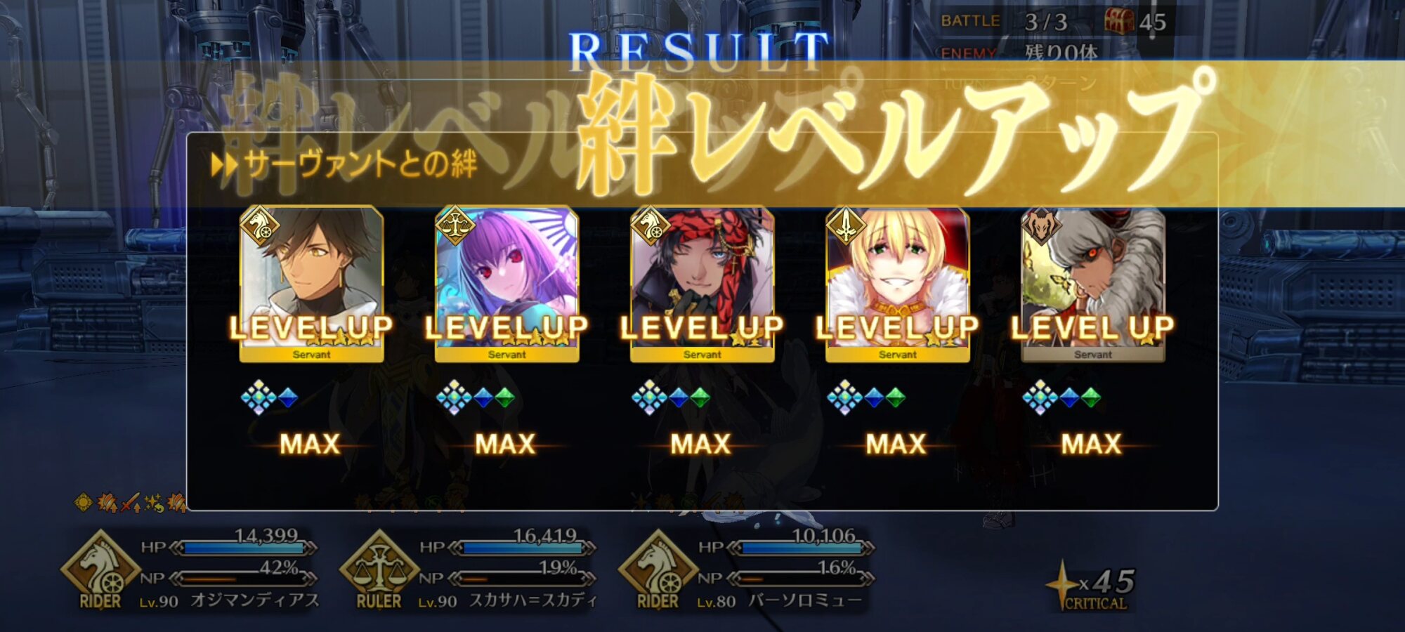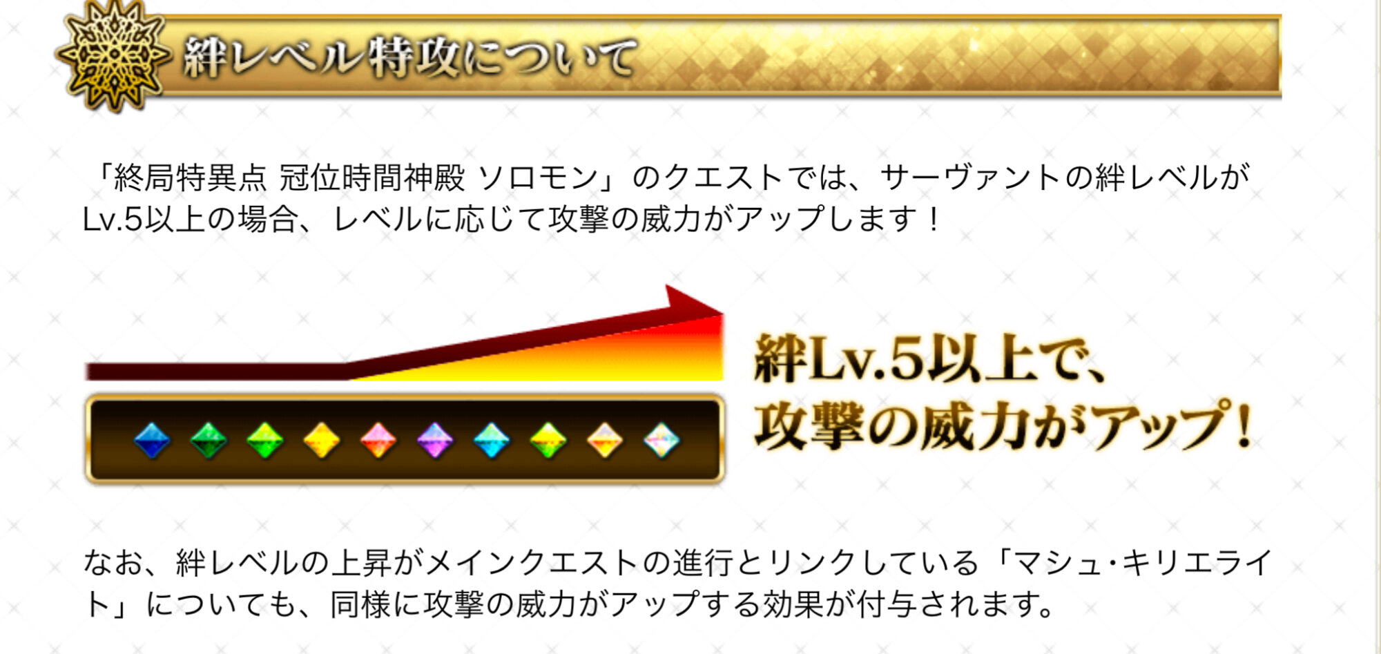 時間神殿…懐かしいメモリー…たておつ。なるほど、最終決戦は在籍サーヴァントの絆レベルの合計値が高ければ高いほどカルデア側のステータスが上がるんですね。