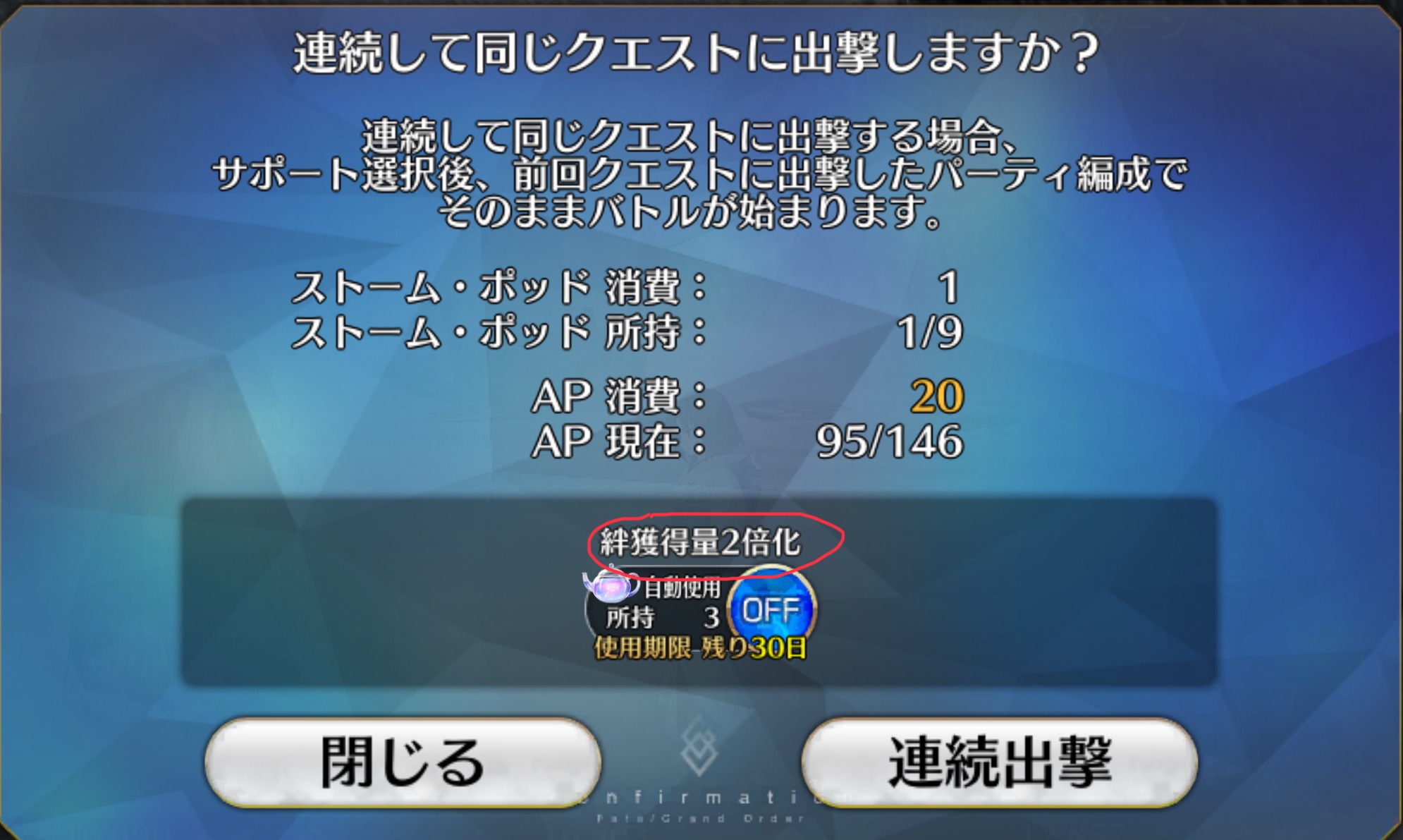 星5は後衛に入れるにはコスト重いからせっかくなら前衛で回れる絆がおいしいクエストがほしい…ブラダマンテ、エレシュキガルなど秩序善や今を生きる人類とそれぞれ絆値アップの条件は合致しているのに反映される数値が低いと勿体ないと思うので…