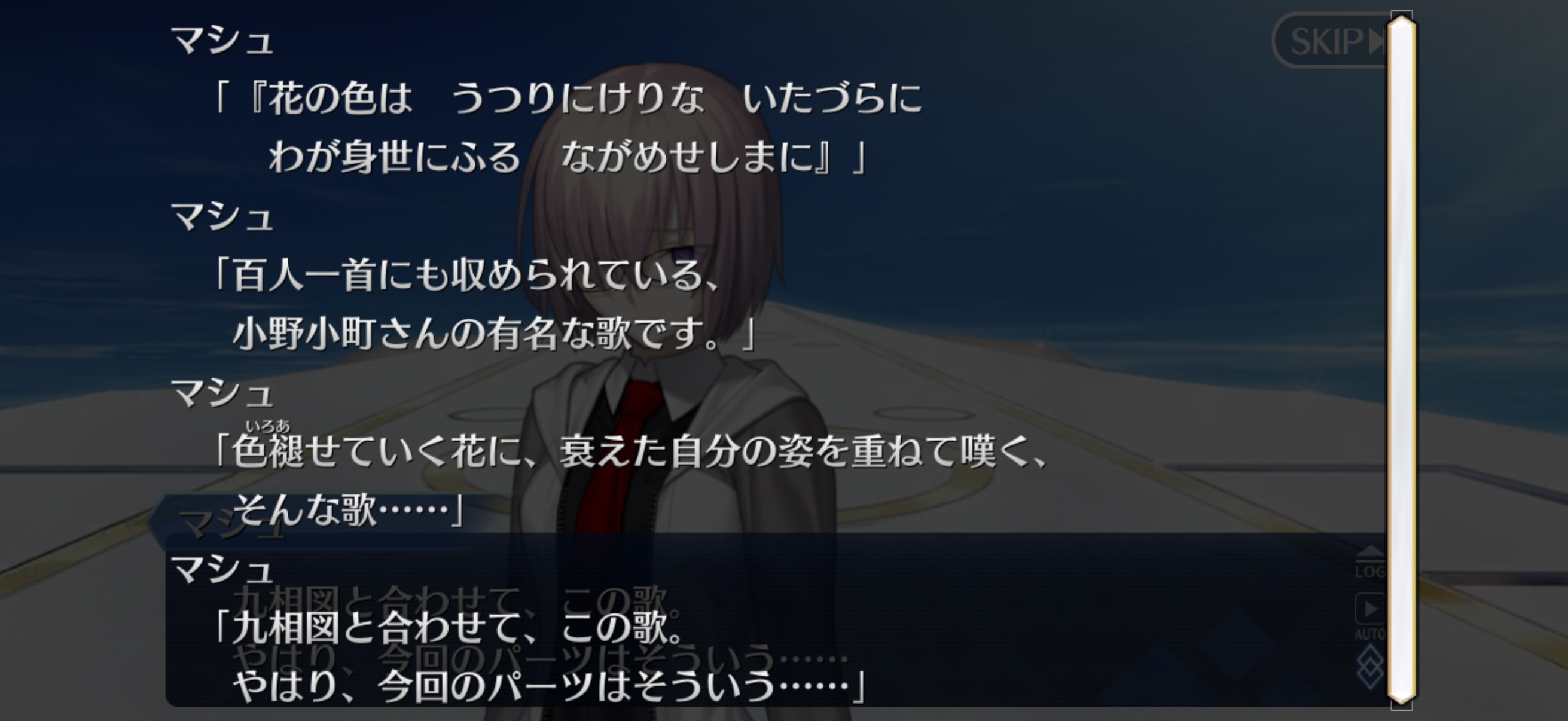 人外の視点から見るとなマシュは永遠ではなくていつか終わりが来るからこそ尊いよねって感じだけど、小野小町のそれは美しい終わりというものについて積極的すぎるからちょっと意見の相違が…ってことかねぇ