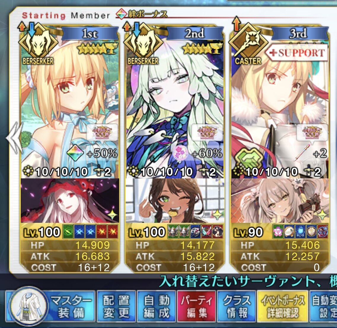 なんか自分が何かを見落とした気がするな…90++はトネリコ&バサキャス(どちらも宝具2以上)で黒聖杯もチョコバフも無くてもなんとかいけそうだな。どっちも光コヤンに特攻刺さるのが強い