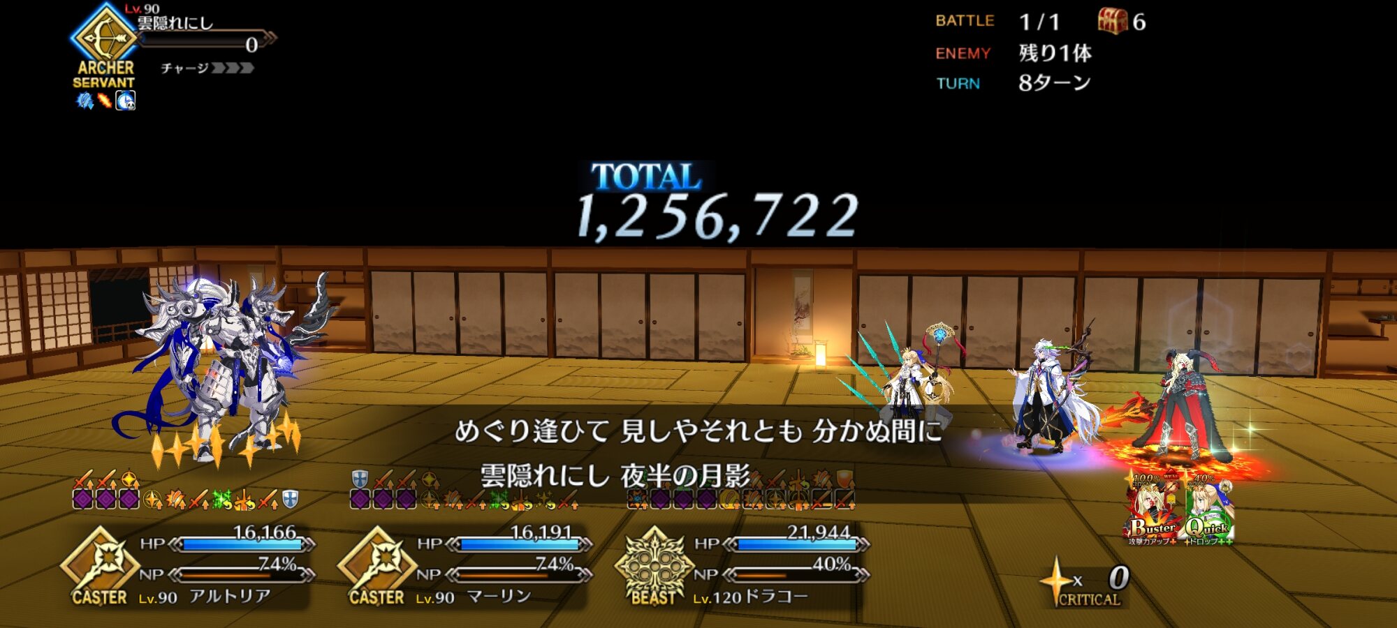 毎ターンの開始時に上句が読み上げられるので、連なる下句のサーヴァントを狙え。