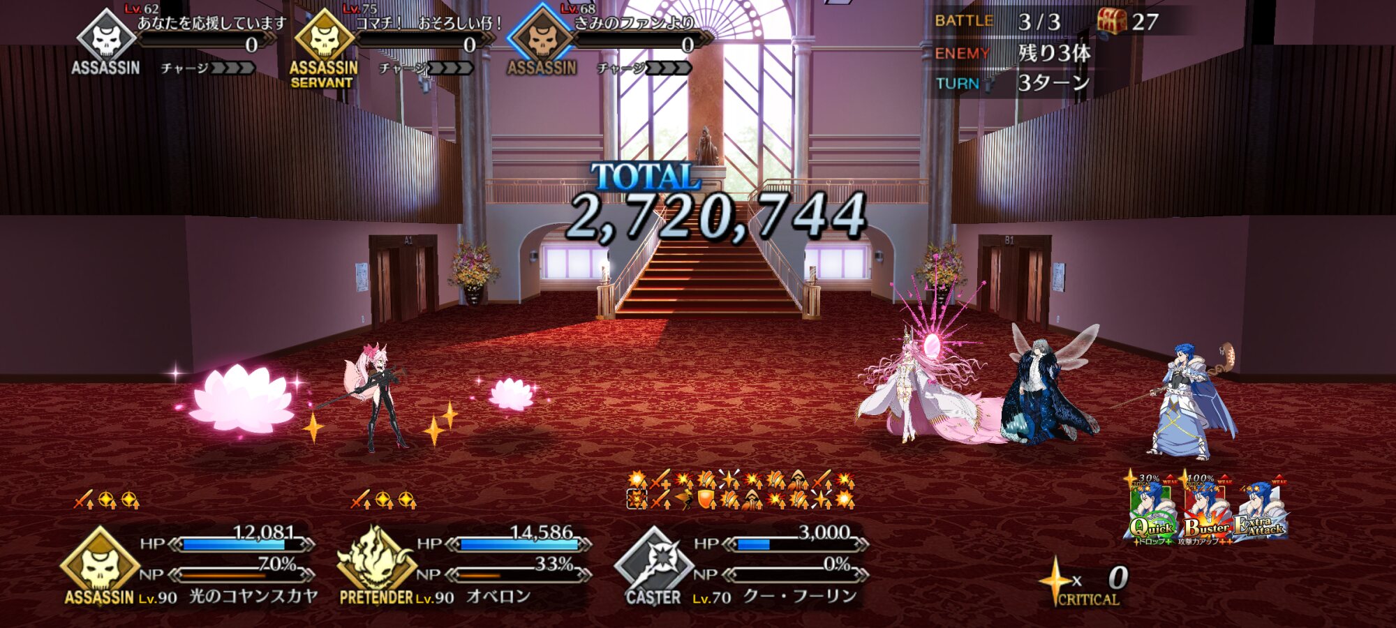 実は高杉社長以外は推定東出先生なんだえーレベル100宝具5金フォウマックスにレベル100クランクインとロックオンチョコ【紅】を授けて光のコヤンスカヤオベロンついでに水着クロエのバフ込みでラストのコヤンスカヤの体力が25000〜30000程度残るっぽいです