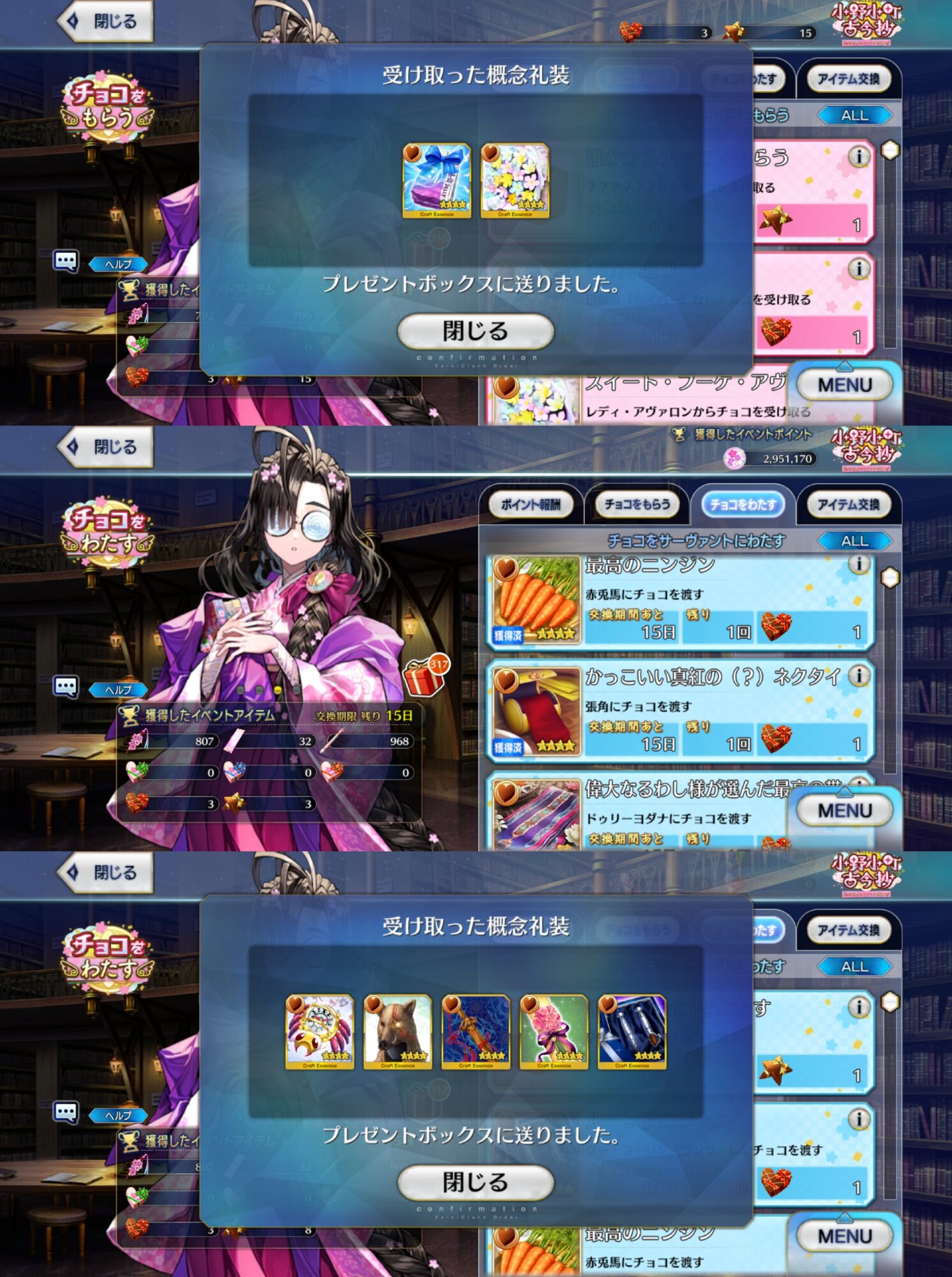 周回優先で交換景品全取りしないと落ち着いてバレンタインボイス聞けないから仕方ないね。我ながら乙女心を何だと思っているのだろうか……SS撮り忘れたが