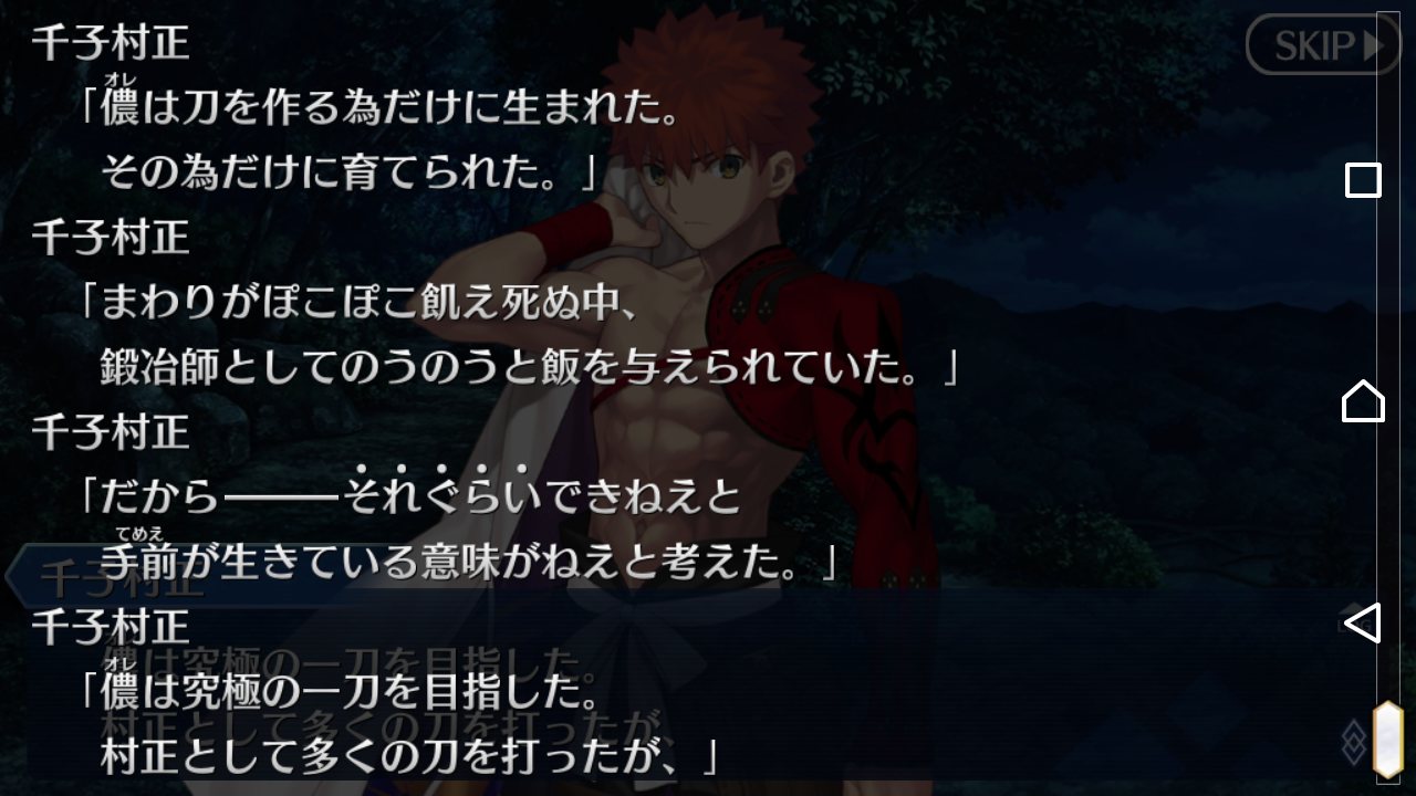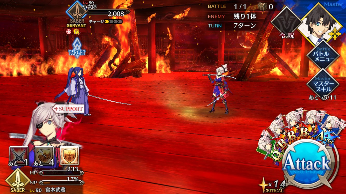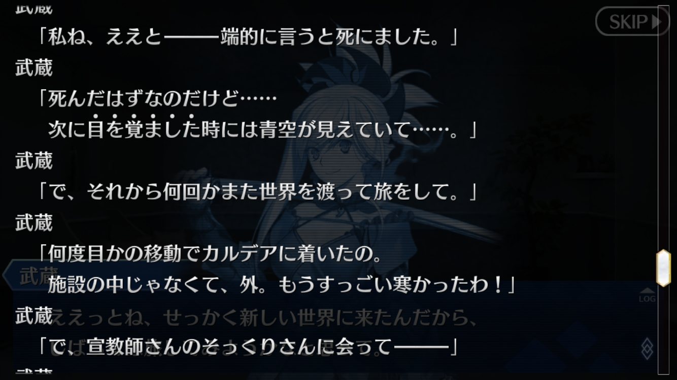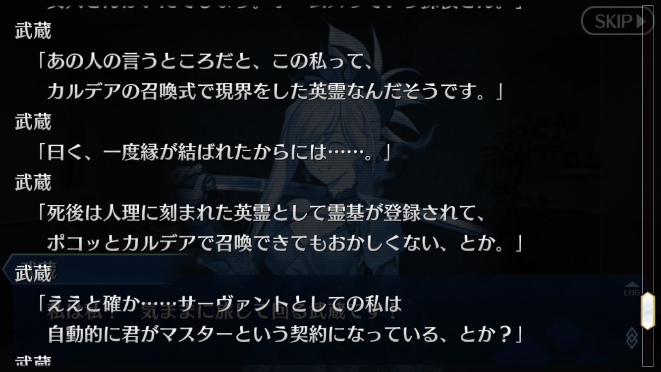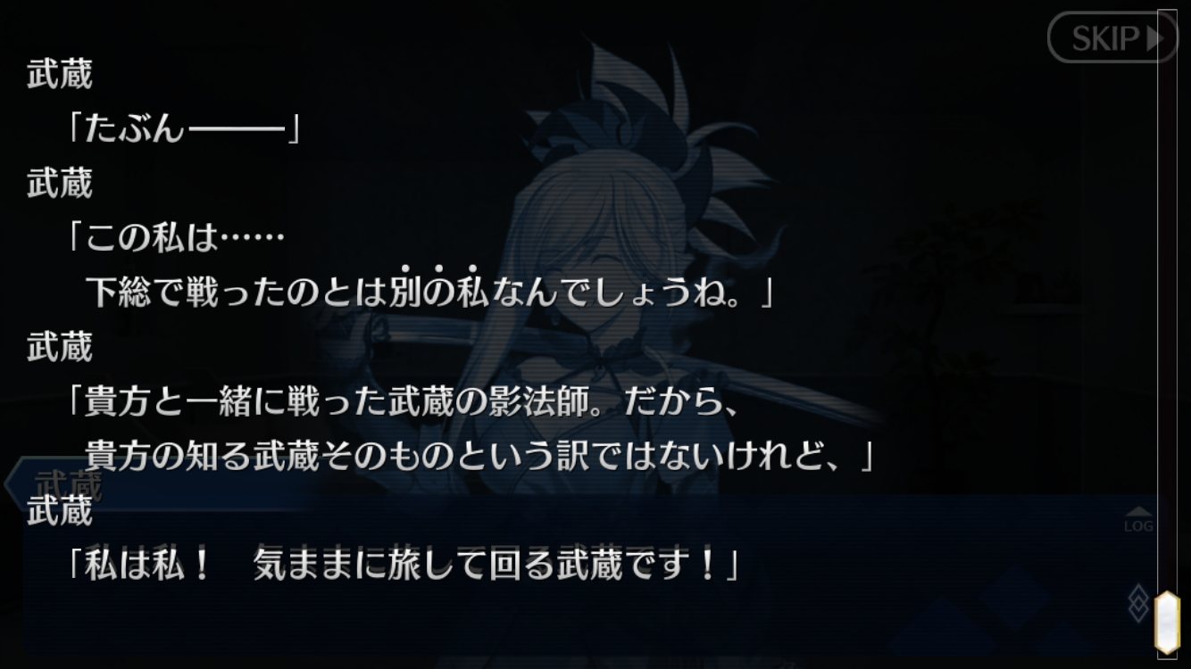 例の刀鍛冶は…めっちゃ欲しいけど当分先じゃないっすかね?今回の話は一貫して徹頭徹尾武蔵の話だったんだよな。カルデア勢はある意味外様で、戦力的には必要不可欠だったんだけど話の中心ではない。ただ最期に武蔵が言っていたように、主人公との出会いがなければそもそも武蔵がここまで戦いに乗り出すこともなかった