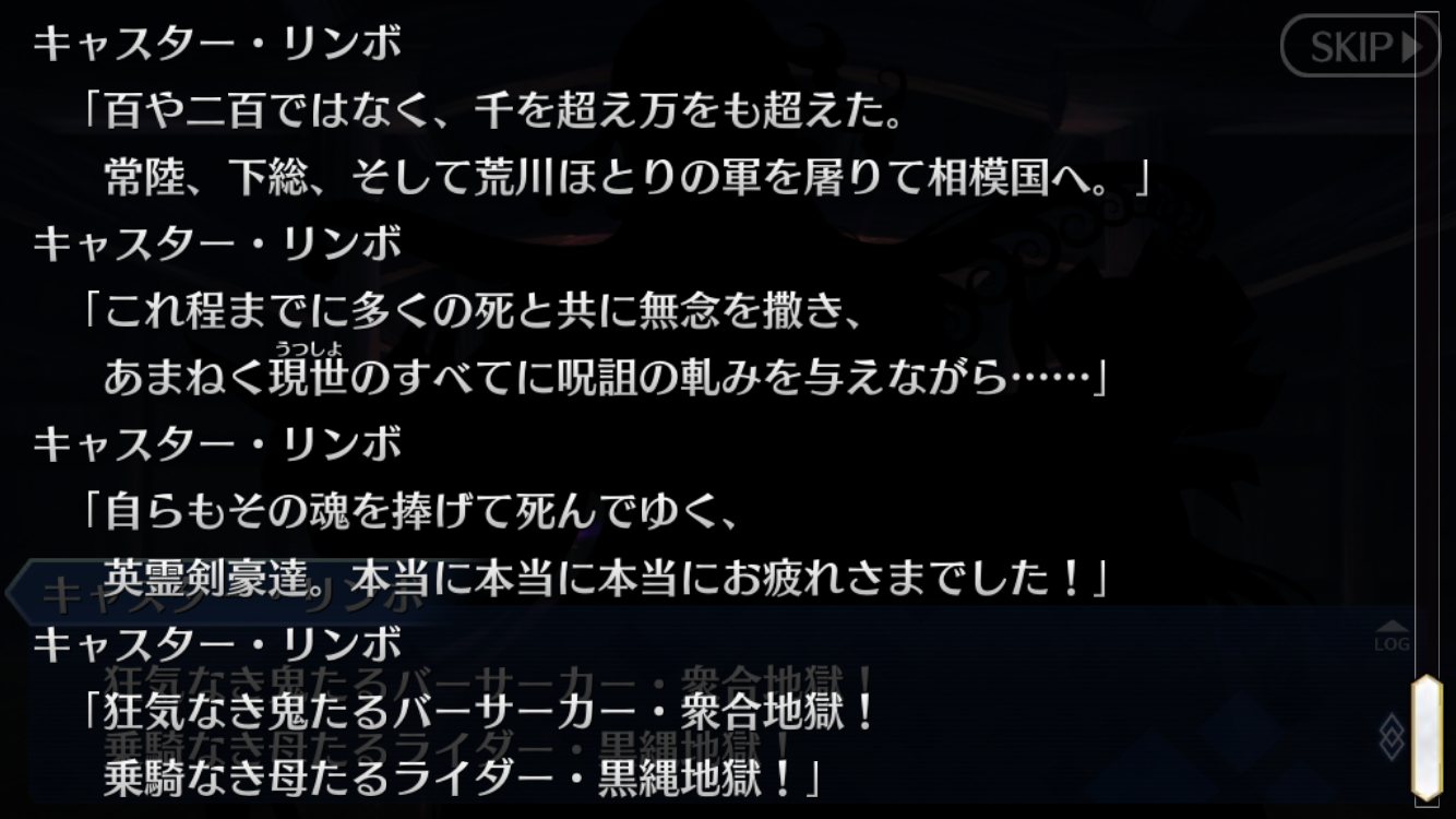 しかもフォロー入らないというても、マスターの顔を真っ先に見に来たのって玉藻の前、きよひー、頼光、酒呑って割とぐだを心配してくれそうなメンバーだしなあ。酒呑童子が農民がやけにイラッとするって言ってたの何かの伏線かと思ったら特にそんなこともなかったなあ
