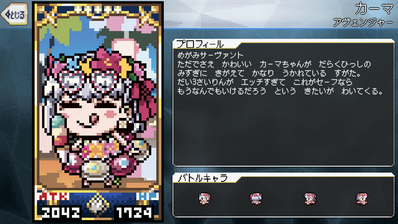 なんちゅうもんを、なんちゅうもんを食わせてくれたんじゃ って言ってた人みたいな表情してそうだ配布のNP礼装でガンガン行けるのありがたいですわあ
