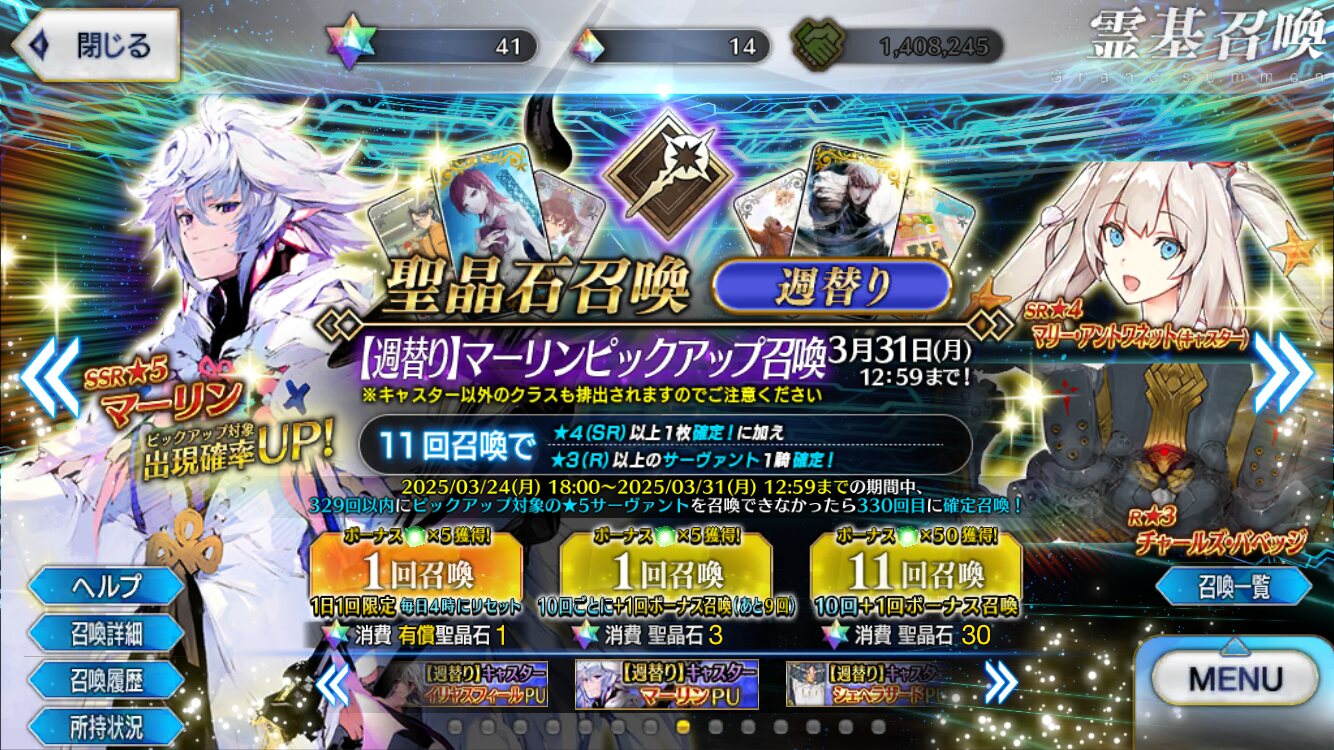 ダヴィンチちゃんやマーリンにキャスターピックアップリベンジできますね。明日からのキャスターピックアップや4章に石持ち越すのもありかな。>>975