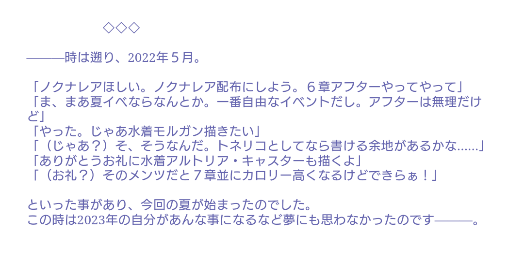 そこなんですよねぇ……奈須さんのスケジュールがギチギチ故に早く読みたいという気持ちがあるとはいえ、余裕ができた時に腰据えてしっかりした幕間を書いて欲しいという気持ちの方が強いです。だからこそ要望出しつつ何時までも待つつもりです。なんなら2部終章後での配信でも全然OKですよ!おお、建てないと