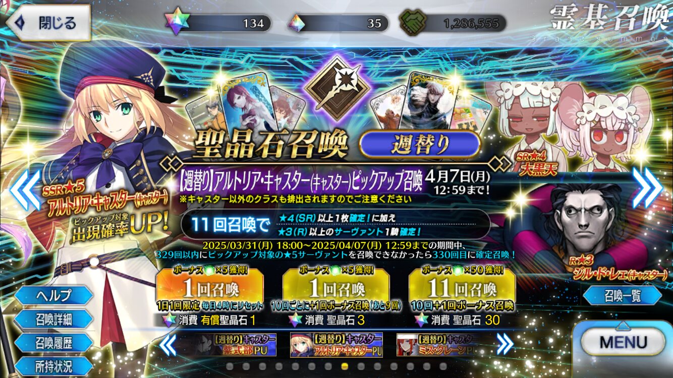 初課金は始めた時にモーさん目当てにセイバーピックアップに一万