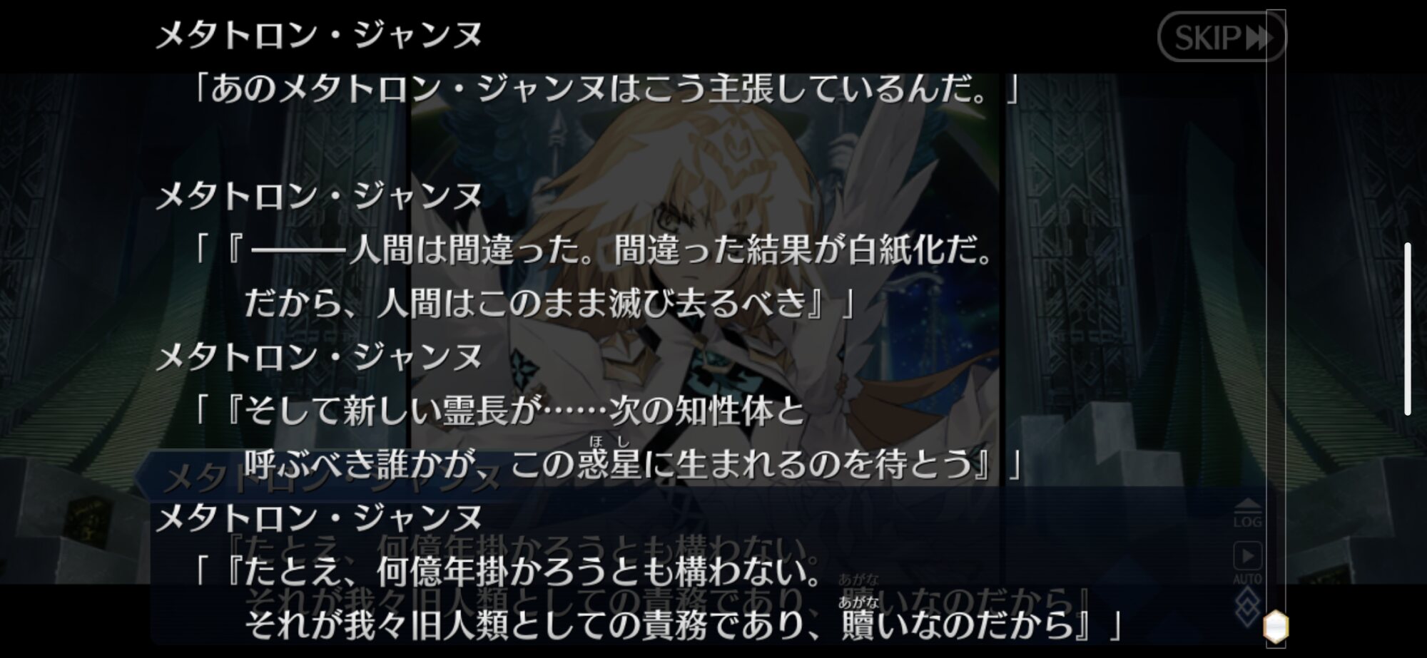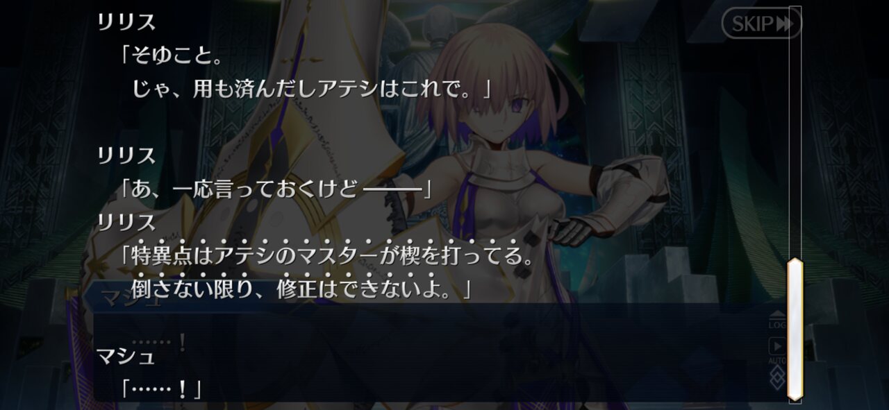 今回の章でリリスはマシュの中に人間として罪にあたる、しかし必要な色に気づかせ与える役割だったんだなーディノスは全員ルーラーみたいな精神だったんだろうなぁ