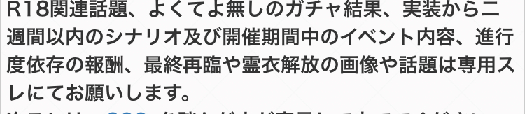 R18関連話題、よくてよ無しのガチャ結果、実装から二週間以内のシナリオ及び開催期間中のイベント内容、進行度依存の報酬、最終再臨や霊衣解放の画像や話題は専用スレにてお願いします。