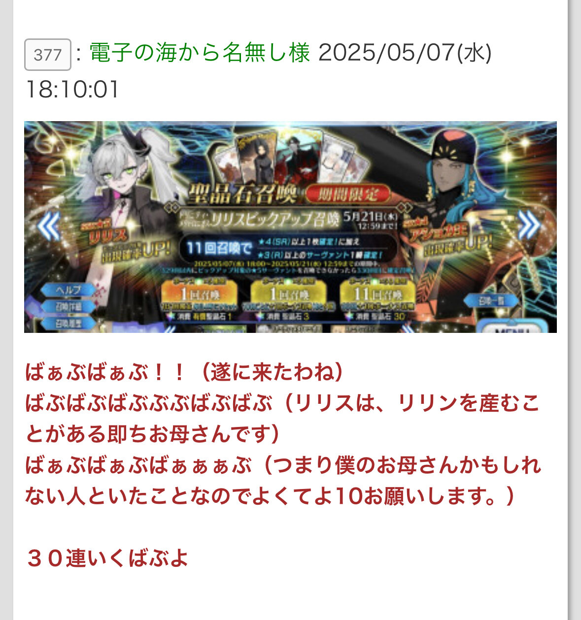 ネタバレ、最終再臨バレに関する話題で書き込むのが躊躇われる場合は以下のスレへ↓