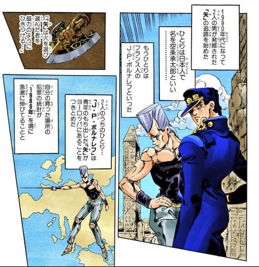 「星の白金(スタープラチナ)、黄金体験(ゴールドエクスペリエンス)、銀の戦車(シルバーチャリオッツ)もか。ブロンズっていなかったっけ?」