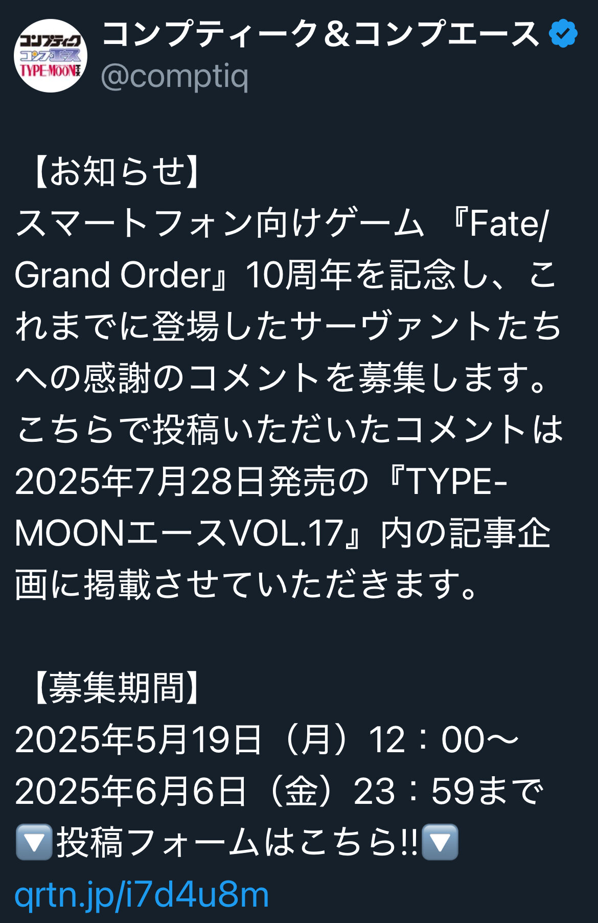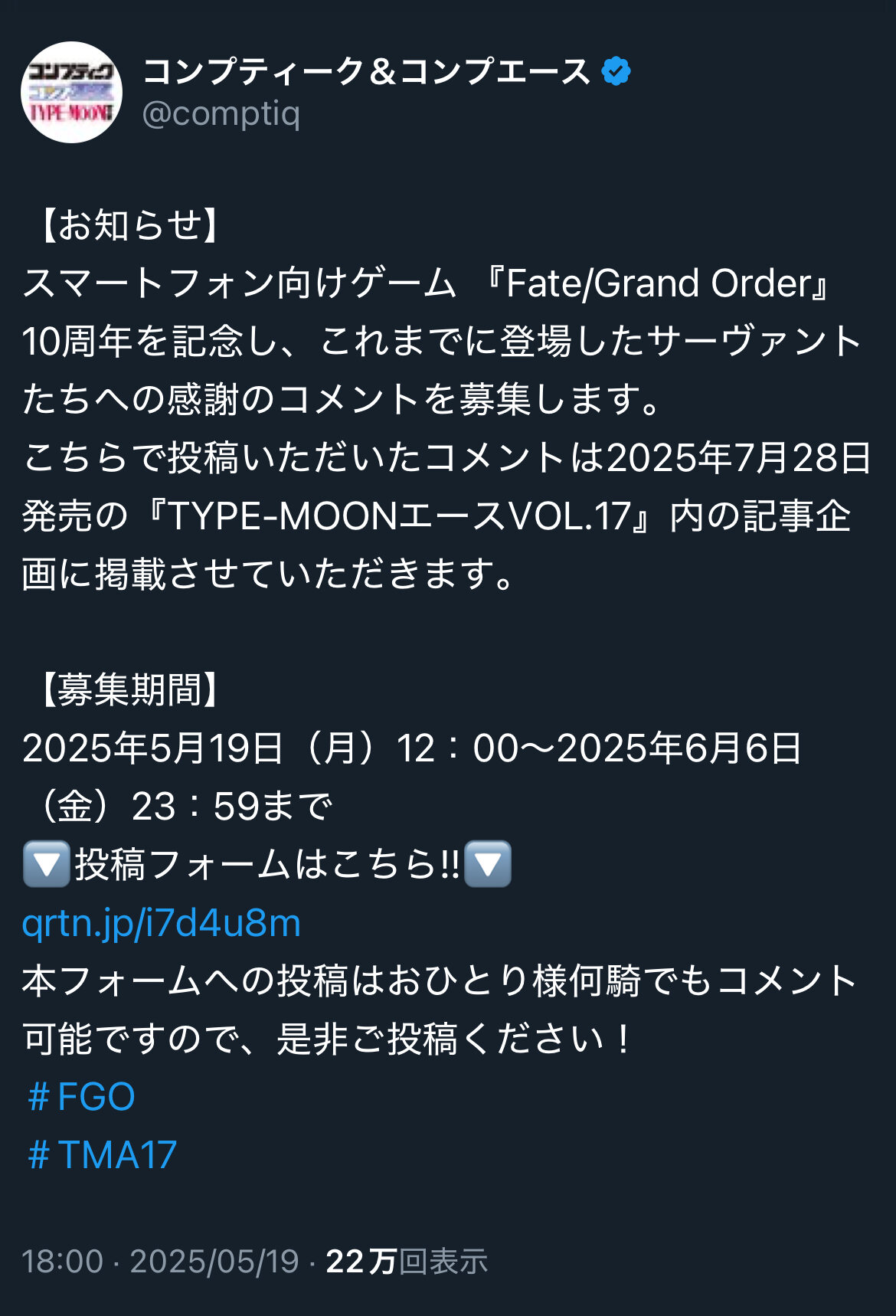次回のTYPE-MOONエースの記事用のサーヴァントへの感謝のコメントが募集されてるので、公の場で感謝を伝えたい方は是非