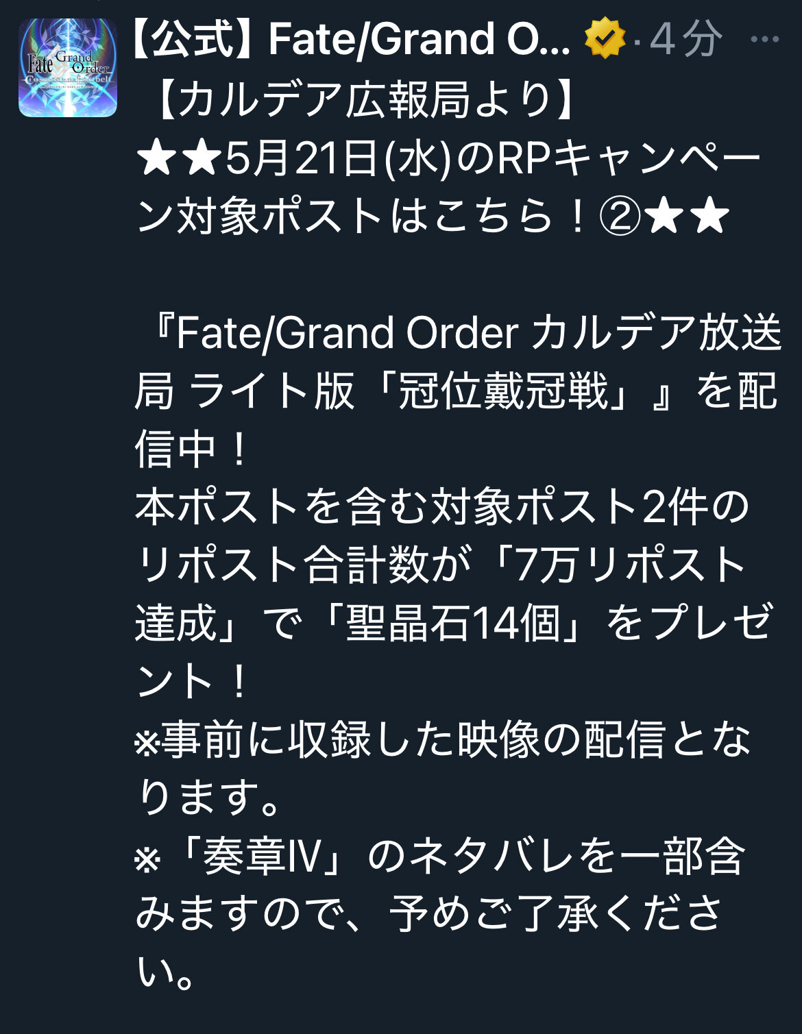 ほんとにもっと別鯖にスポットライト当ててくれよ明日の23:59までの冠位戴冠戦期間限定ミッションが発生してるから注意な