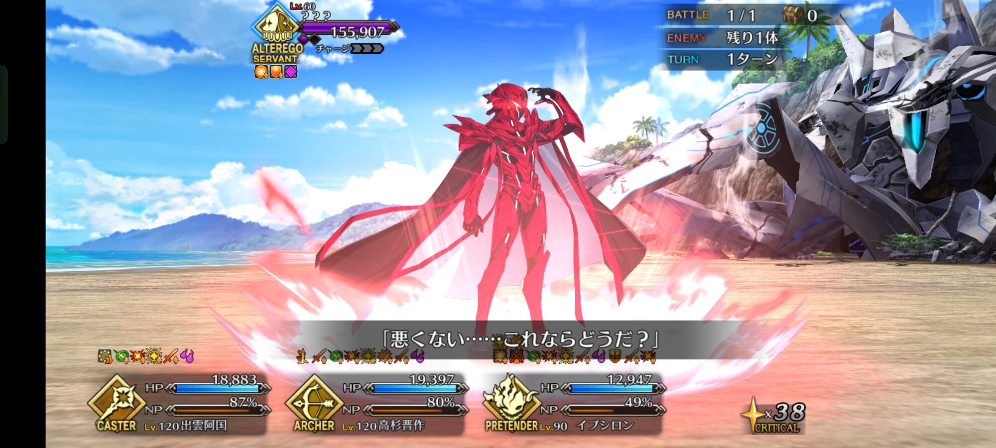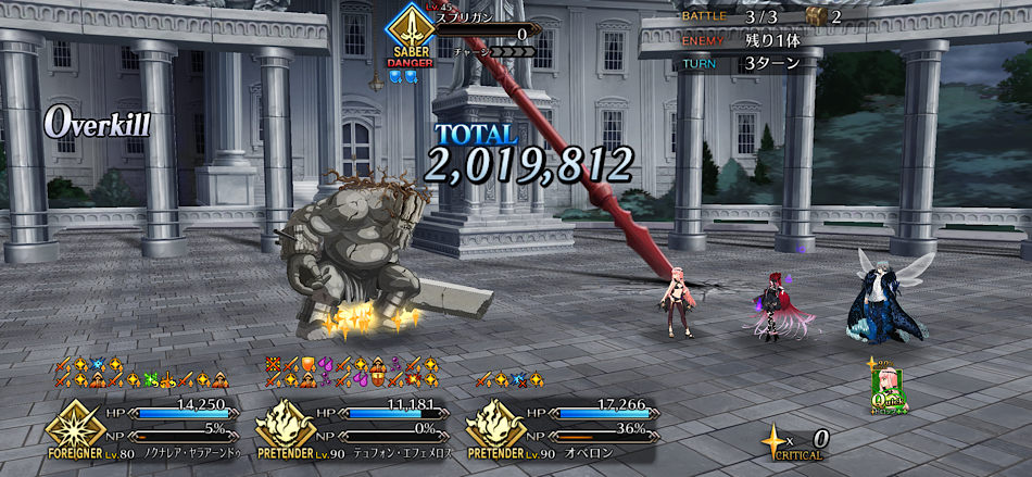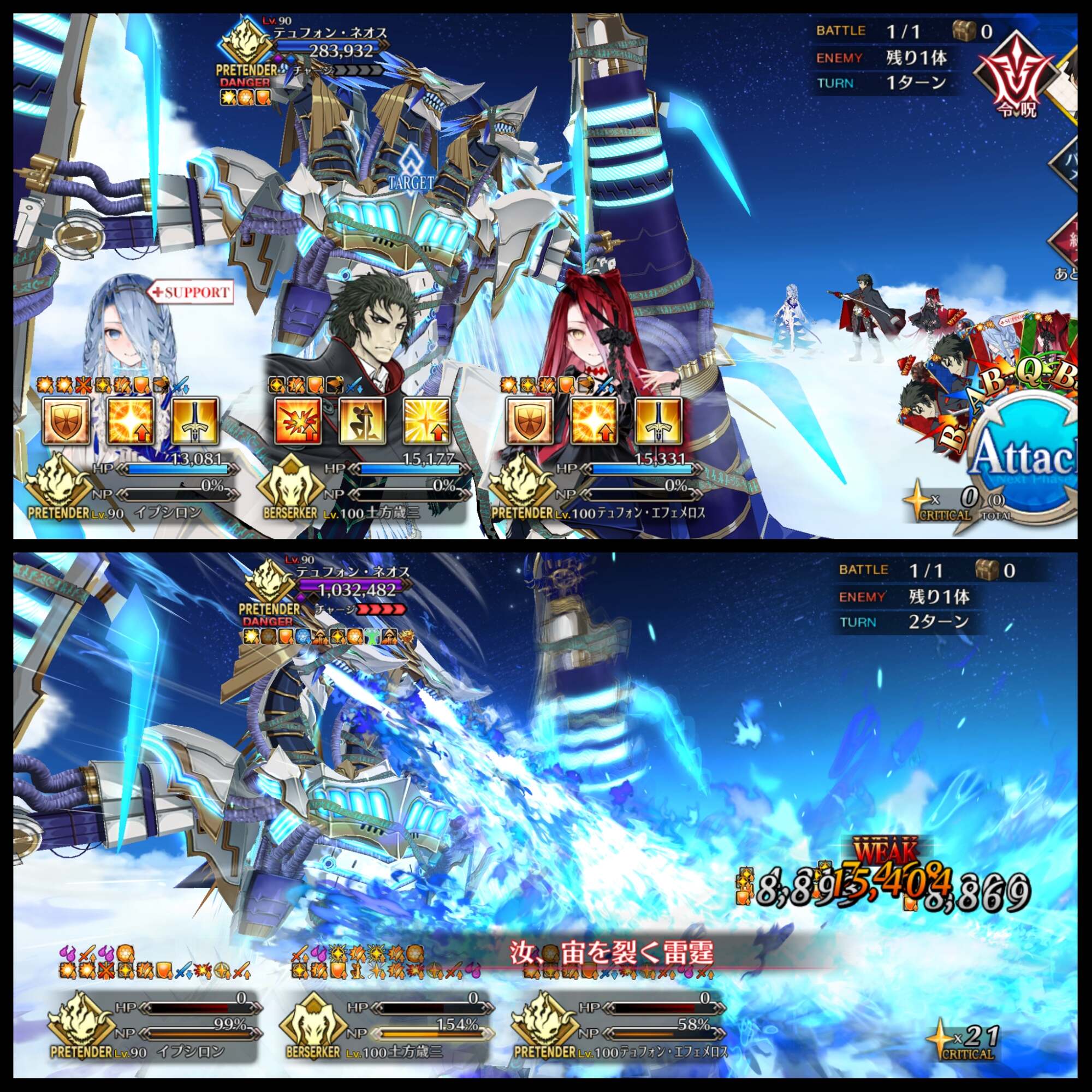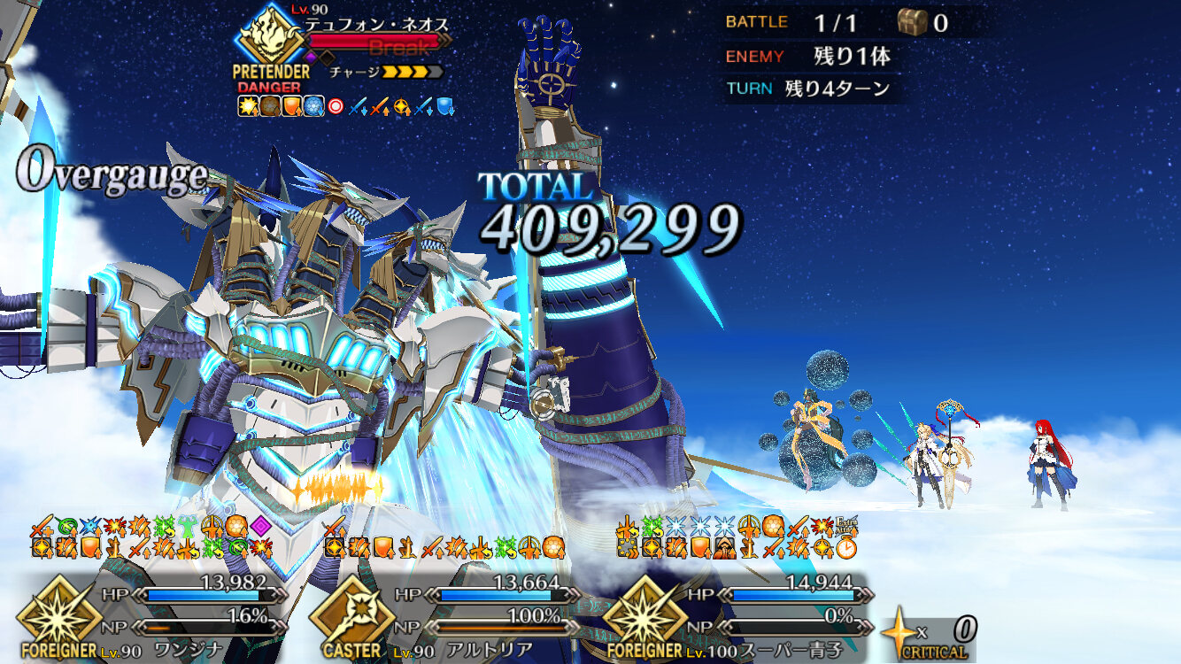 並大抵の敵なら1撃で数十万数百万単位のダメージで吹っ飛ぶ程の一撃がたった数万くらいにまで減衰する有様だし、テュフォンの支援なしで早期撃破狙うなら戦い方もクラスも相性良いサーヴァントを理想個体化してるのがスタートライン、そこからデスチェンジありきでギリギリまで攻めた立ち回りしないと厳しいですよ>>946