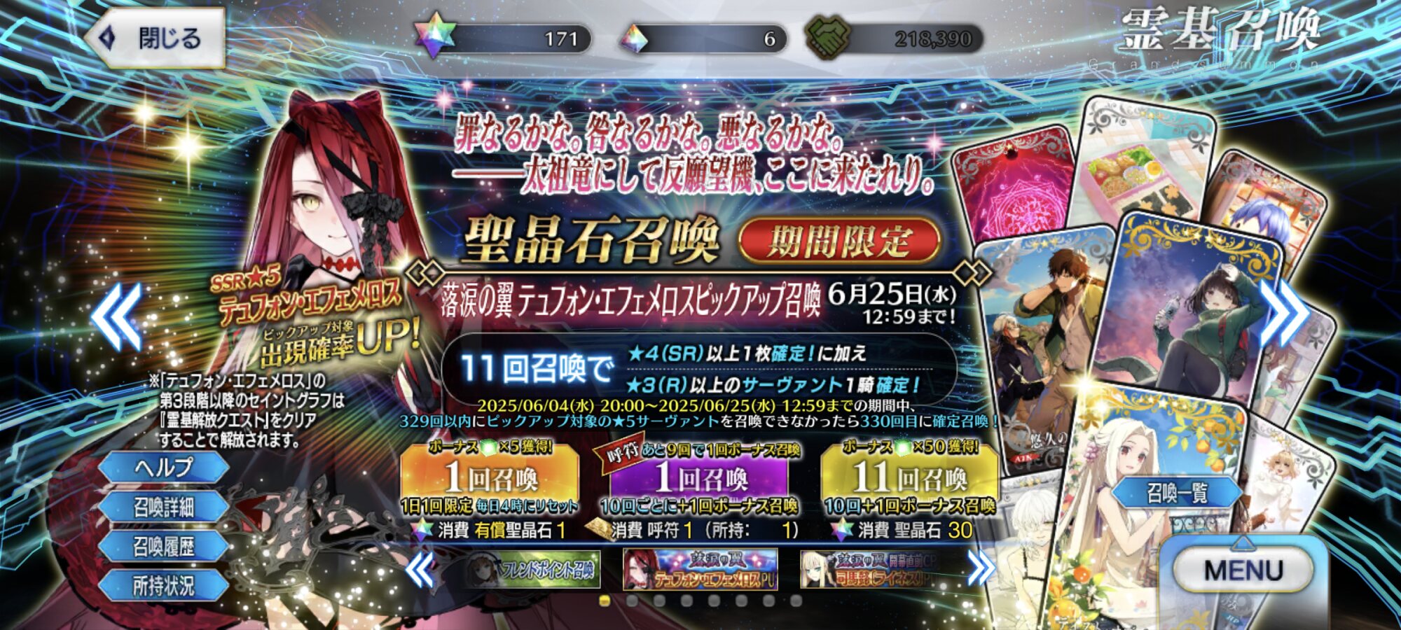 狙ってなかったんだけど呼符で来てさぁムーブの可能性もあるそういえばテュフォンに聖杯を突っ込むという謎ムーブができるのか。あと、グランドの都合考えると次に来る鯖のクラスが予測できるのかも?せいぜい直前のバーサーカーや次々のグランドのクラスは来ない程度だろうけども。
