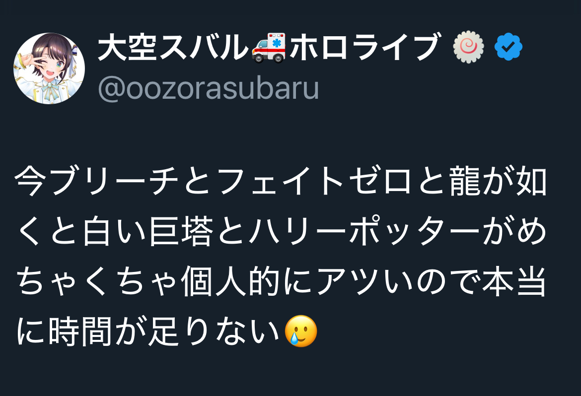 話と話の合間で「頭痛くなってきたから薬取ってくる」って離脱したのがwハピエン村の住人であるスバルちゃんにはちょっと刺激が強かったかw(この前に見たSN(DEEN版)の結末にもちょっとショック受けてたみたいだし)