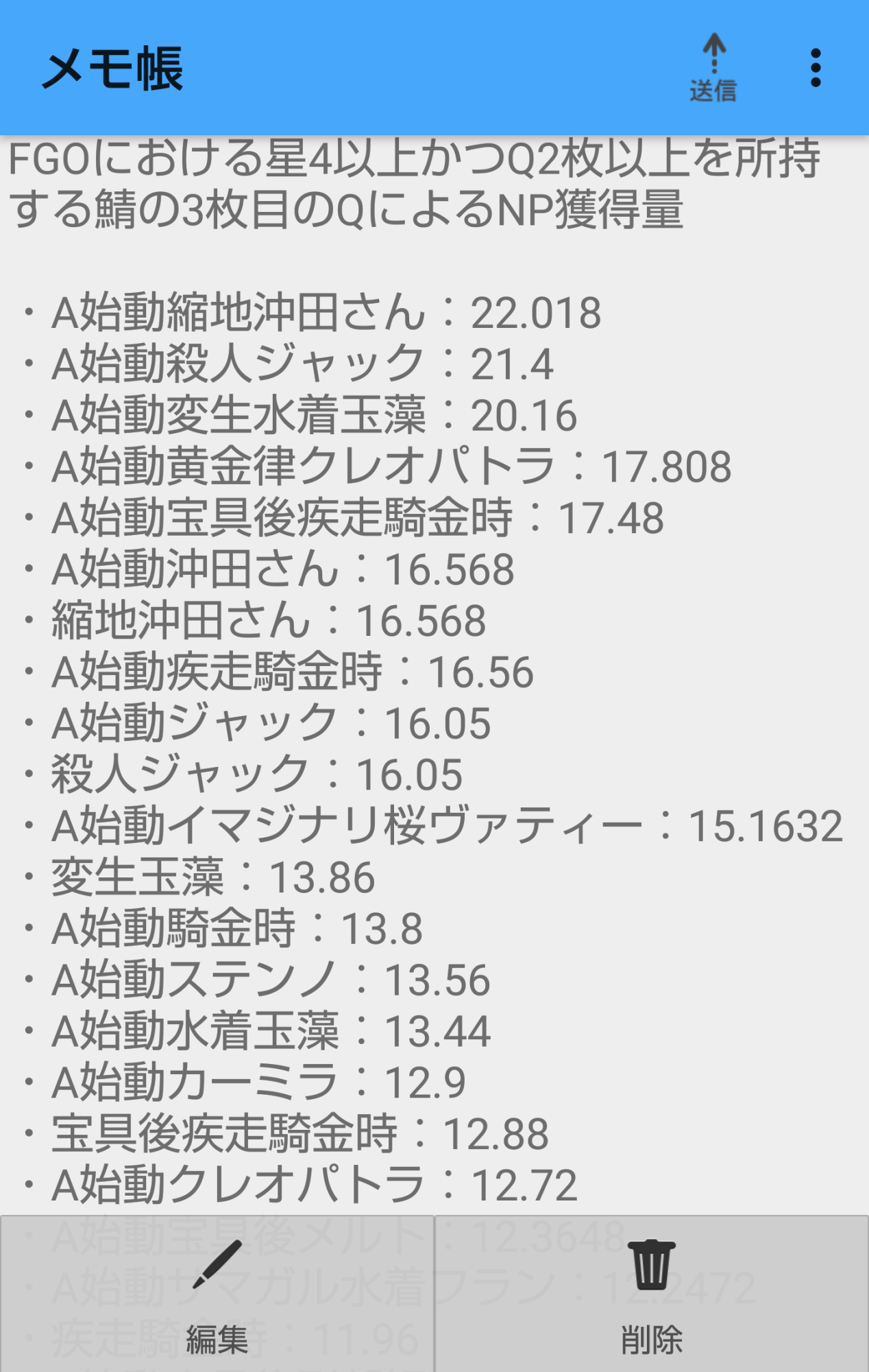 私は現在Q2枚以上持ち鯖のQのNP効率表を作成中なので作り次第こちらに上げます。 - 3名無し2017/10/29(Sun) 19:33:02報告