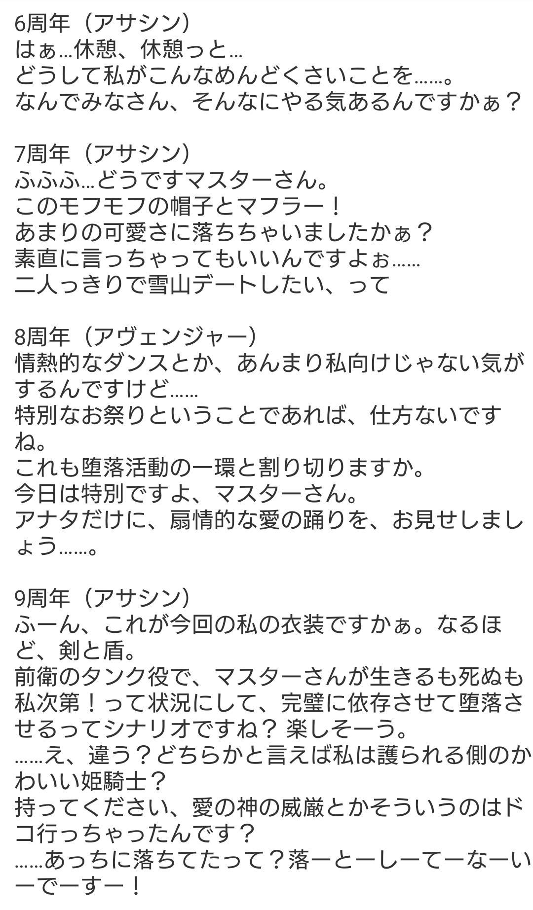 R18関連話題、よくてよ無しのガチャ結果、実装から二週間以内のシナリオ及び開催期間中のイベント内容、進行度依存の報酬、最終再臨や霊衣解放の画像や話題は専用スレにてお願いします。