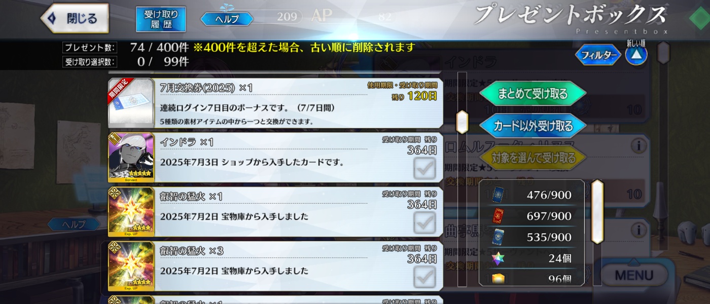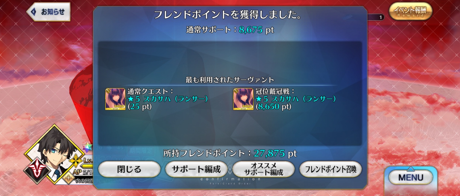 リンゴも足りないし、冠位戦はしばらく自然回復分でゆっくり、かな