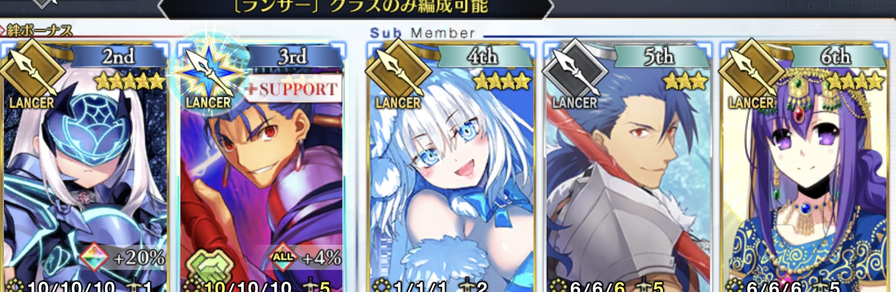 ランサーの霊衣持ちって星4以上しか居ないから礼装減らさなきゃいけないんだよねー、だから15%とか10%でも問題ないと思うラムダグラントにしたけど絆礼装と冠位接続どっちにしといた方がいいんだろ