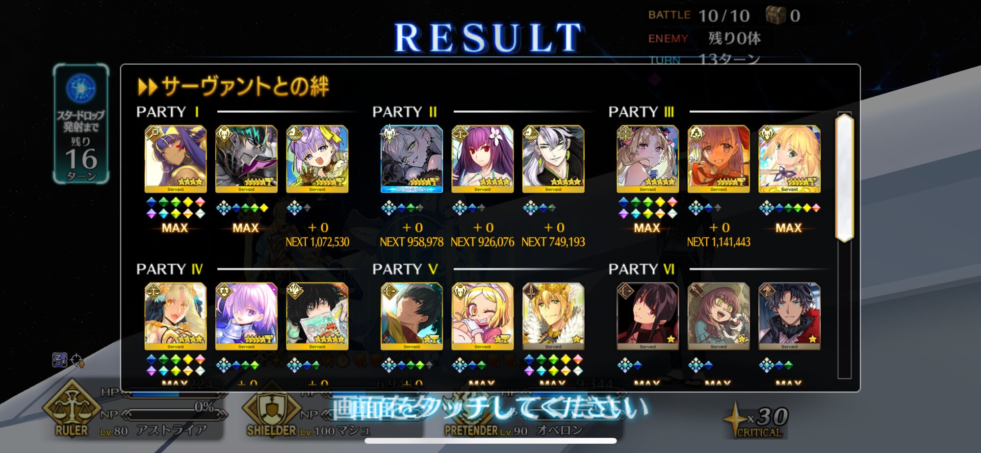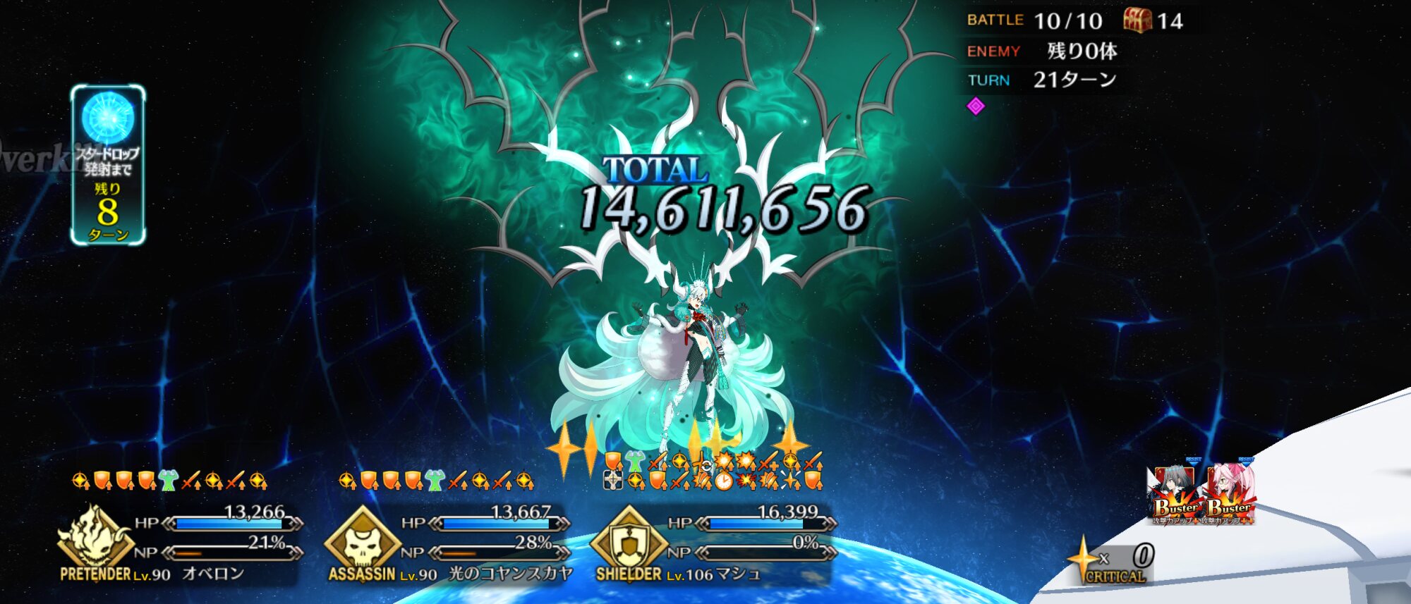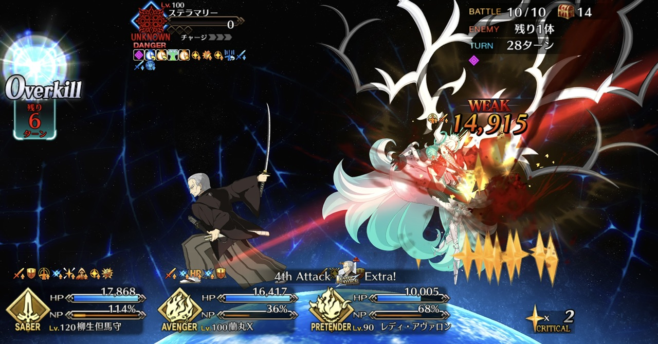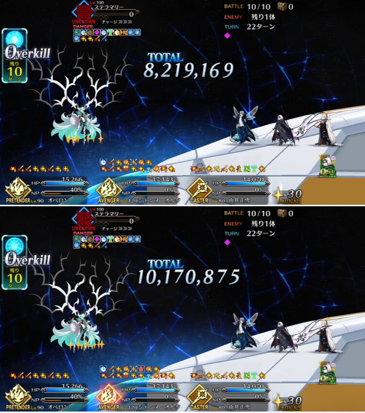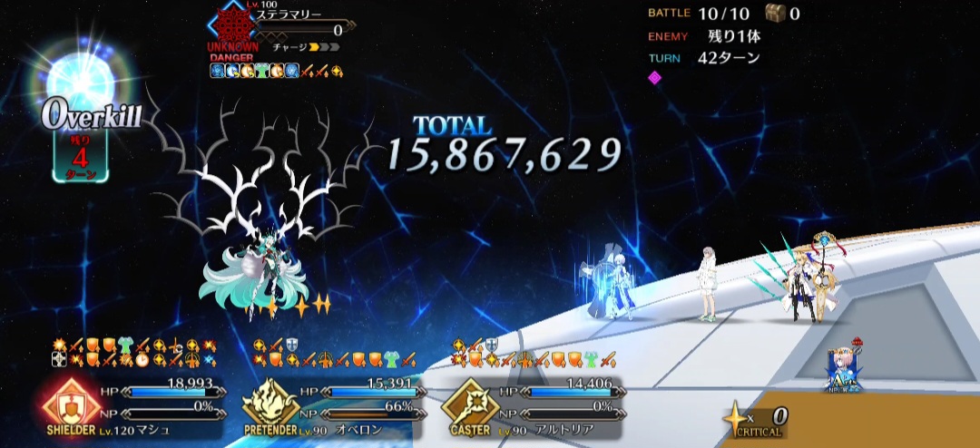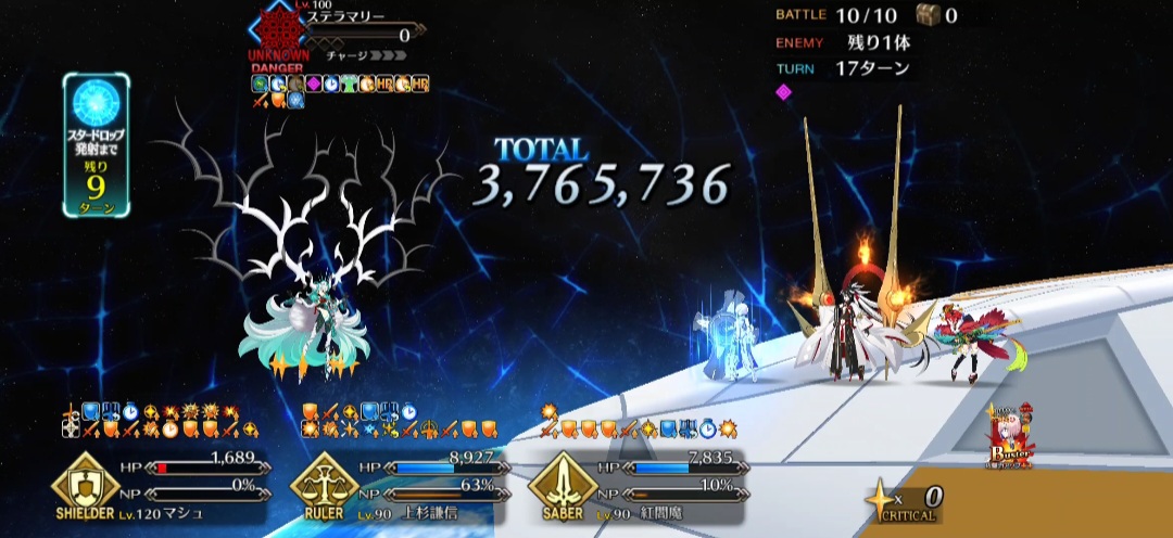 ・最終ゲージは最大HP増加があるので、HP増加が切れるまでターン制無敵・回避、ガッツや仕事が終わった編成を死に出しししてターン数を稼げると良い(HP増加込みで飛ばせるなら別に稼がなくても良い)