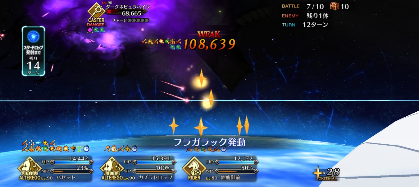 ・BAQちゃんと相手の色デバフ見て殴れば制限ターンが減らないのでステラマリー戦開始時で残り3、4Tくらいでも良い。なので雑魚敵を1ターンで葬るよりステラマリー見越した編成に少し寄せた方が良い。