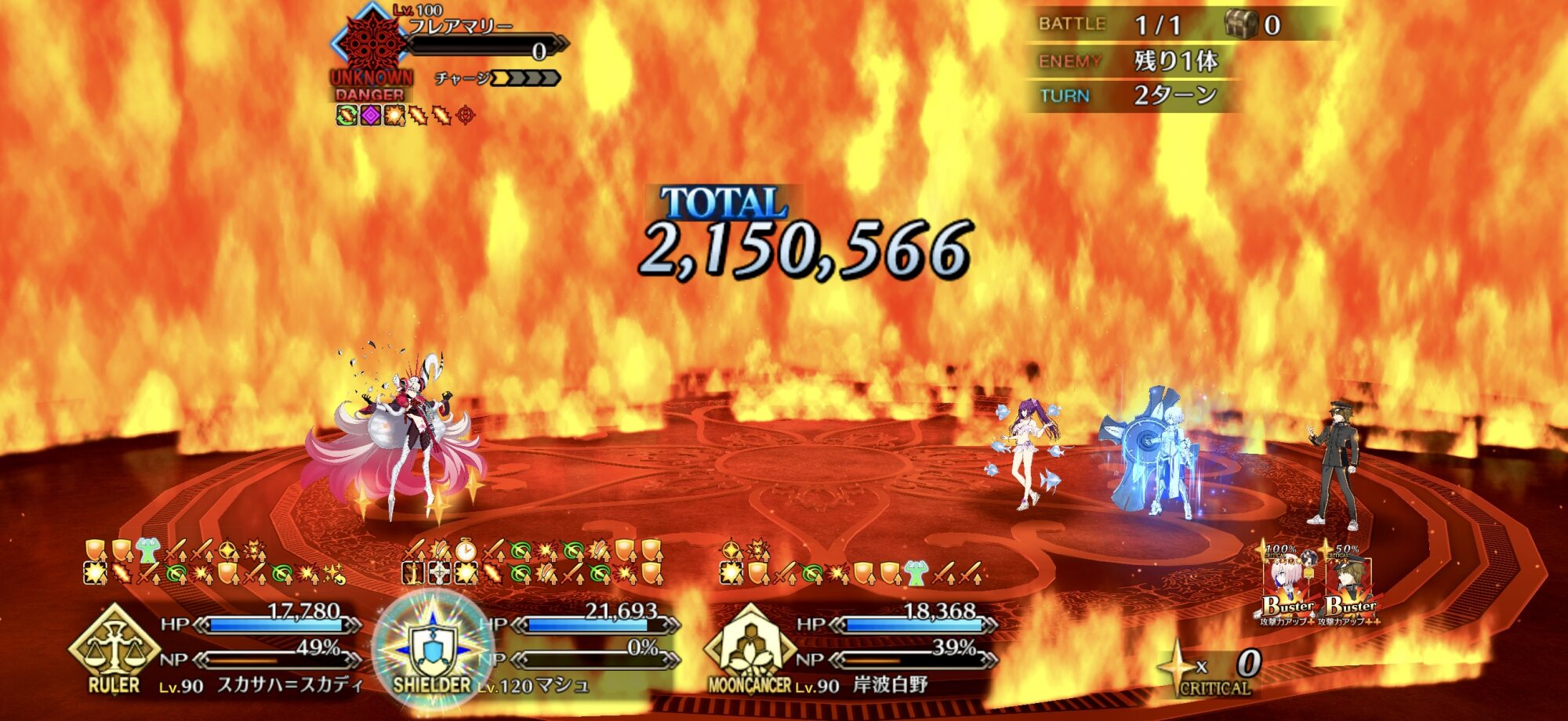 スカディのバフを全部シエル先輩に振って、アルクの宝具で取り巻きを破壊、そしてシエル先輩のB2枚クリティカルでふっとばす