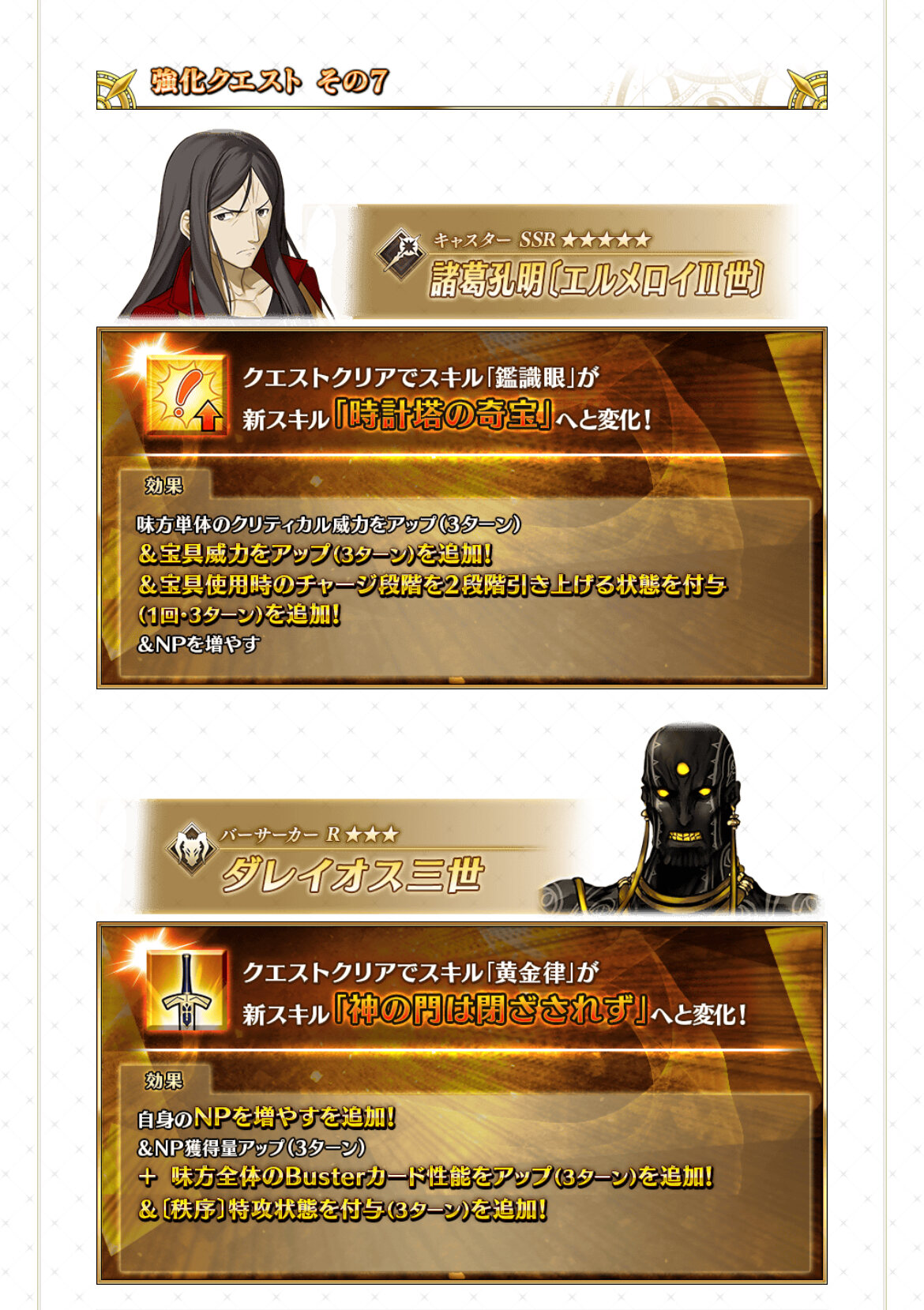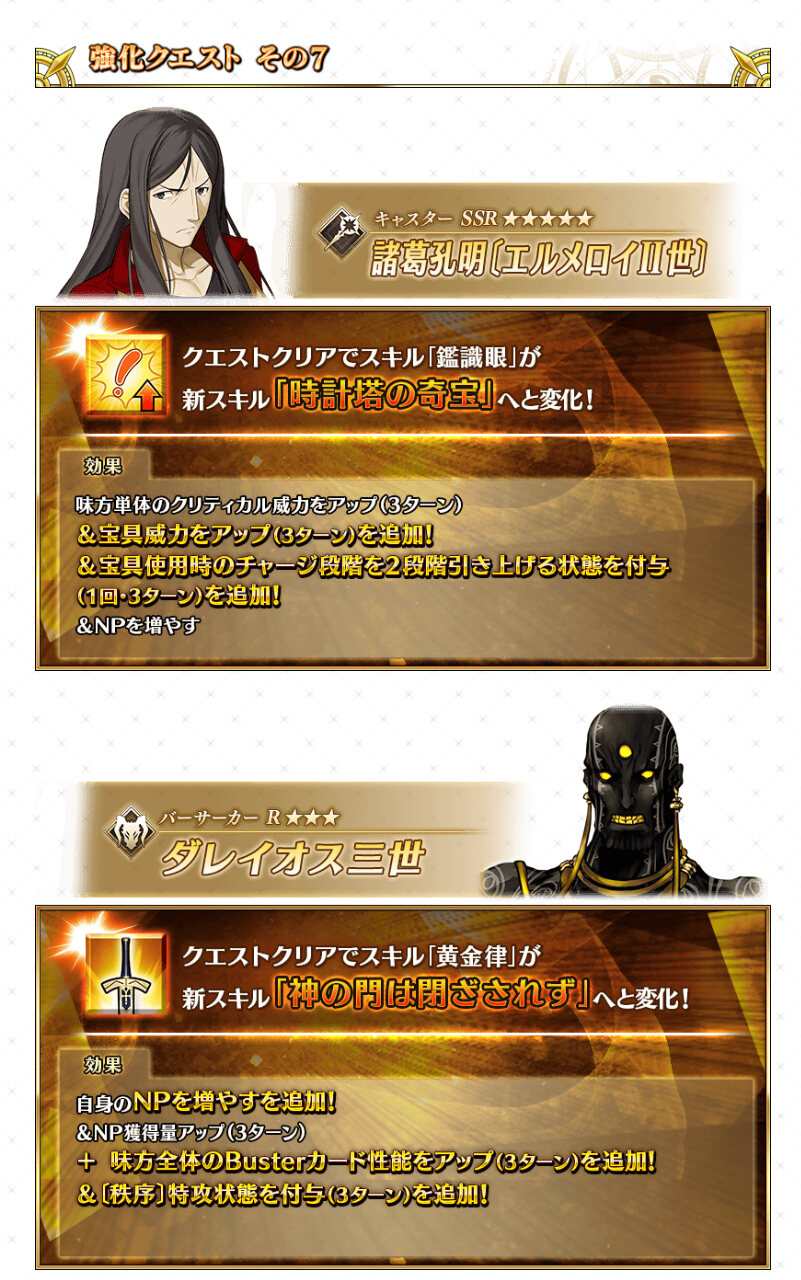 スレ画が終章仕様になってるぐらいか?ダレイオス、NPチャージと全体バフ貰えたのもあって、イベントの周回でも重宝されるようになりそうだ。