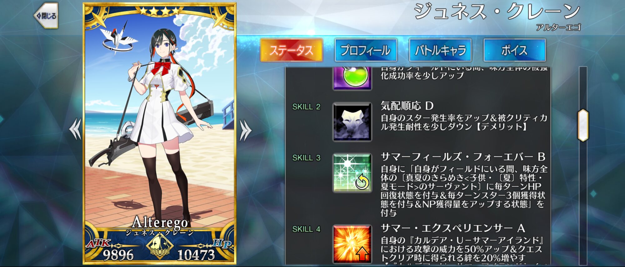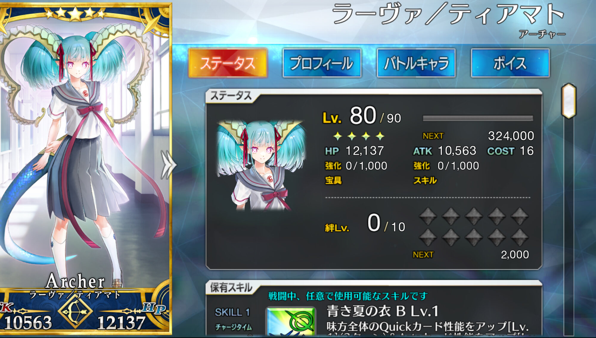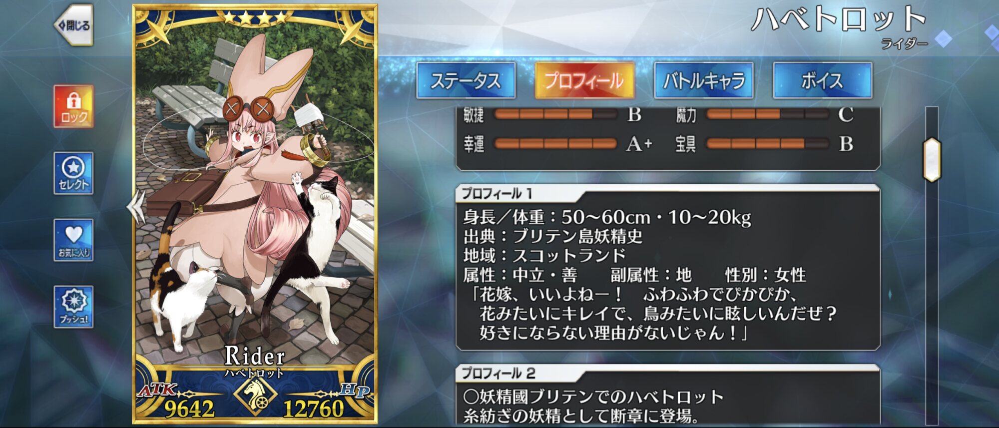 うーん、スキルに書いてあること多いけどよく読むと周回で使いやすい単体剣アタッカーって感じですね……!ブリテンの妖精は着痩せする。