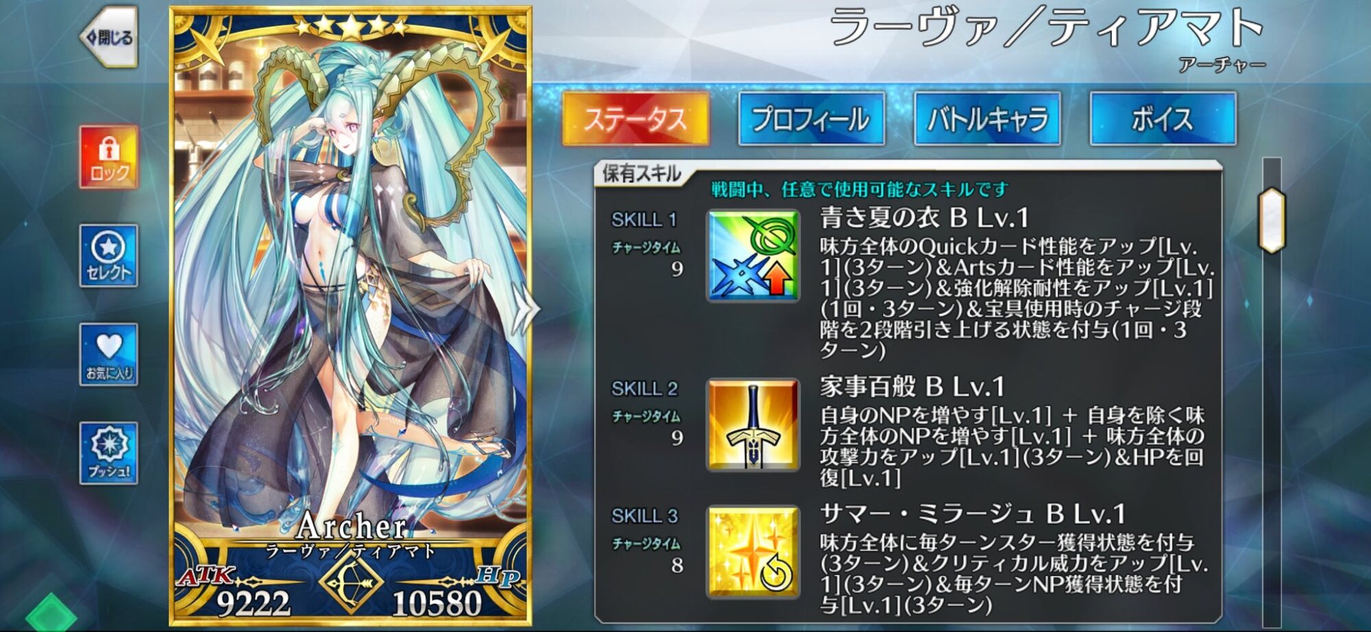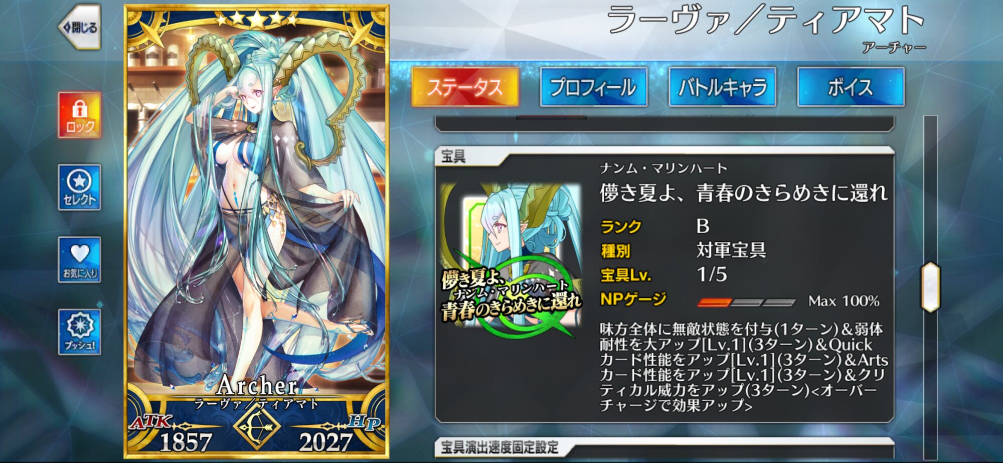 ぬんのステップで踊るのか水着ティアマトさん、自身NP50+自分以外の全体NP30+味方全体毎ターン10+毎ターン星+クリ威力アップ+AQバフ+OC2段階アップ、っていうとんでもないものもってねぇ!?見間違いか!?