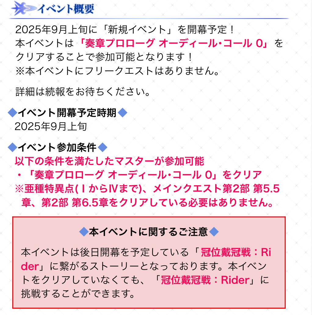 次回イベントが冠位戴冠戦 ライダーとの連動発表してるから、来月(9月)はほぼ確実にあると思って良いかと