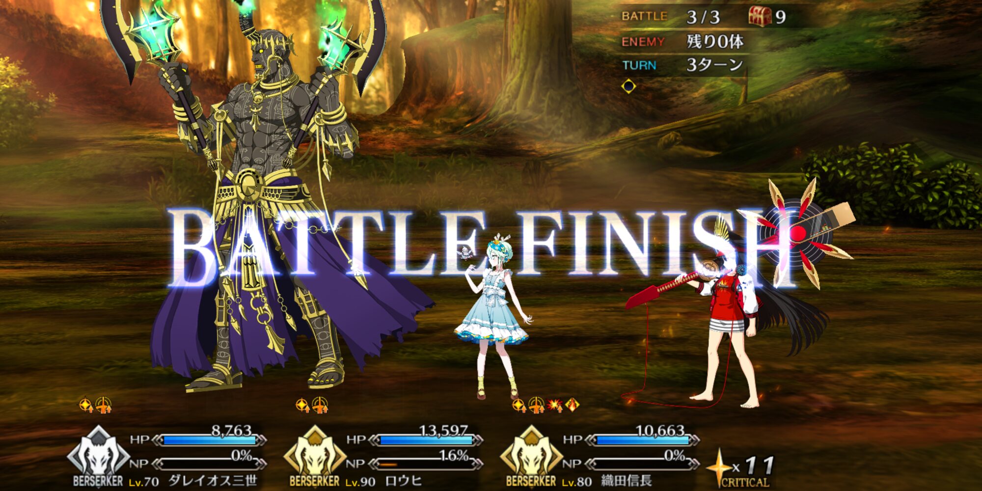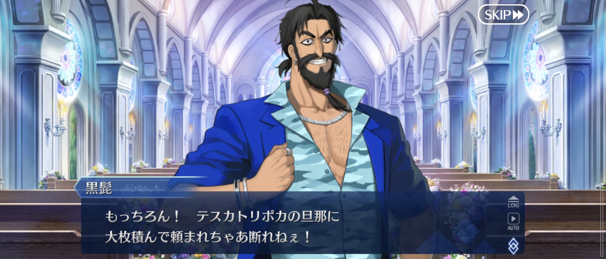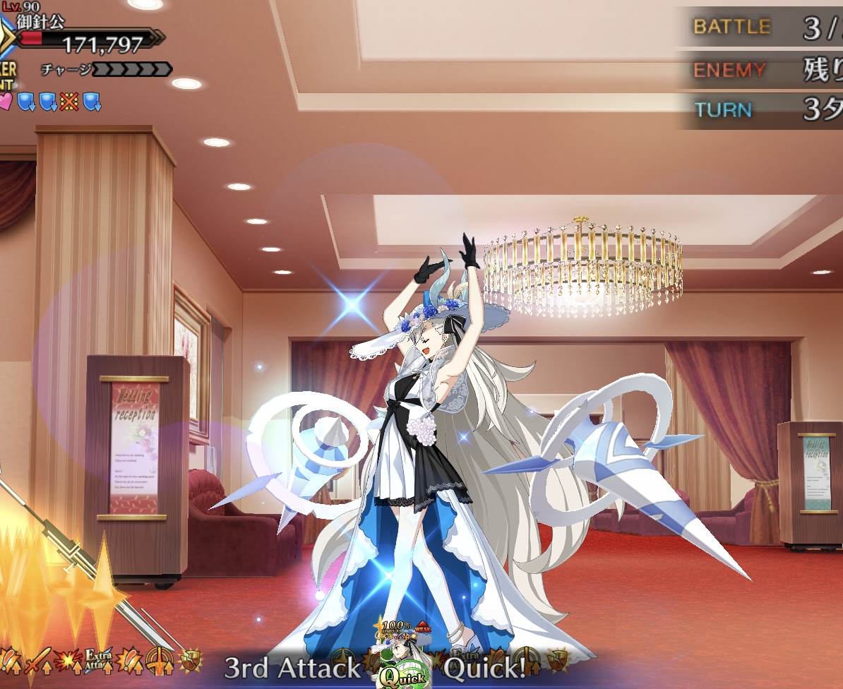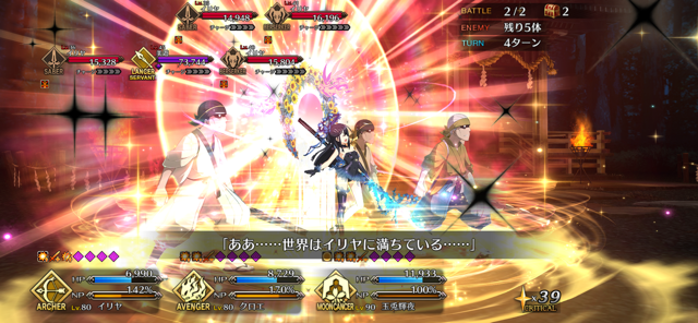スキル2『鮫のカリスマ』味方全体に攻撃力アップと混沌属性には追加でクリ威力アップを3T付与+自身に星獲得状態と星獲得。第1スキルの格式高さが台無しになったわね