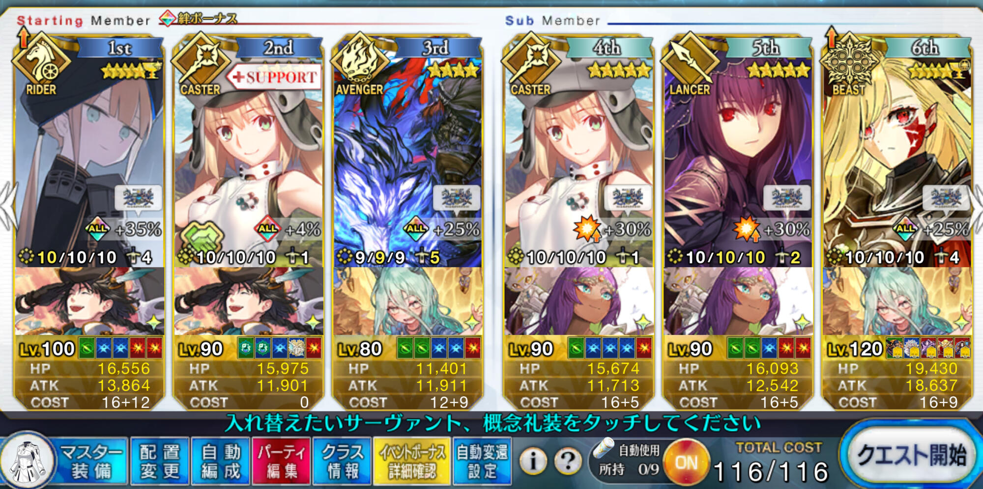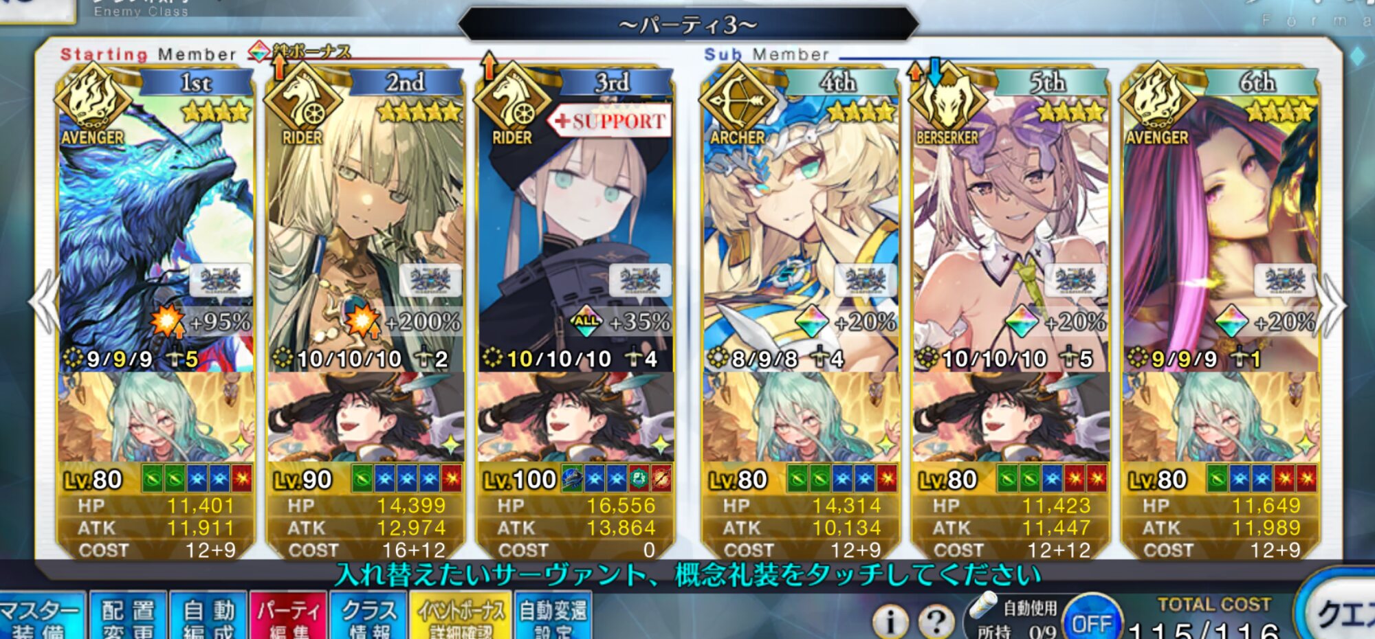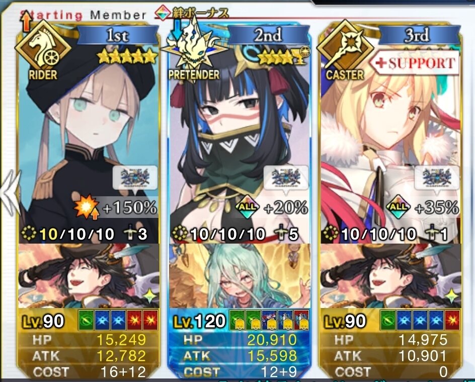 Wキャストリア+テノチでガッツ解除+100レベ龍馬(未凸イベ星5礼装)で90+++も回れるわ。