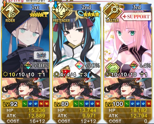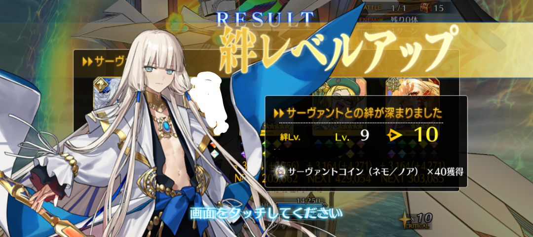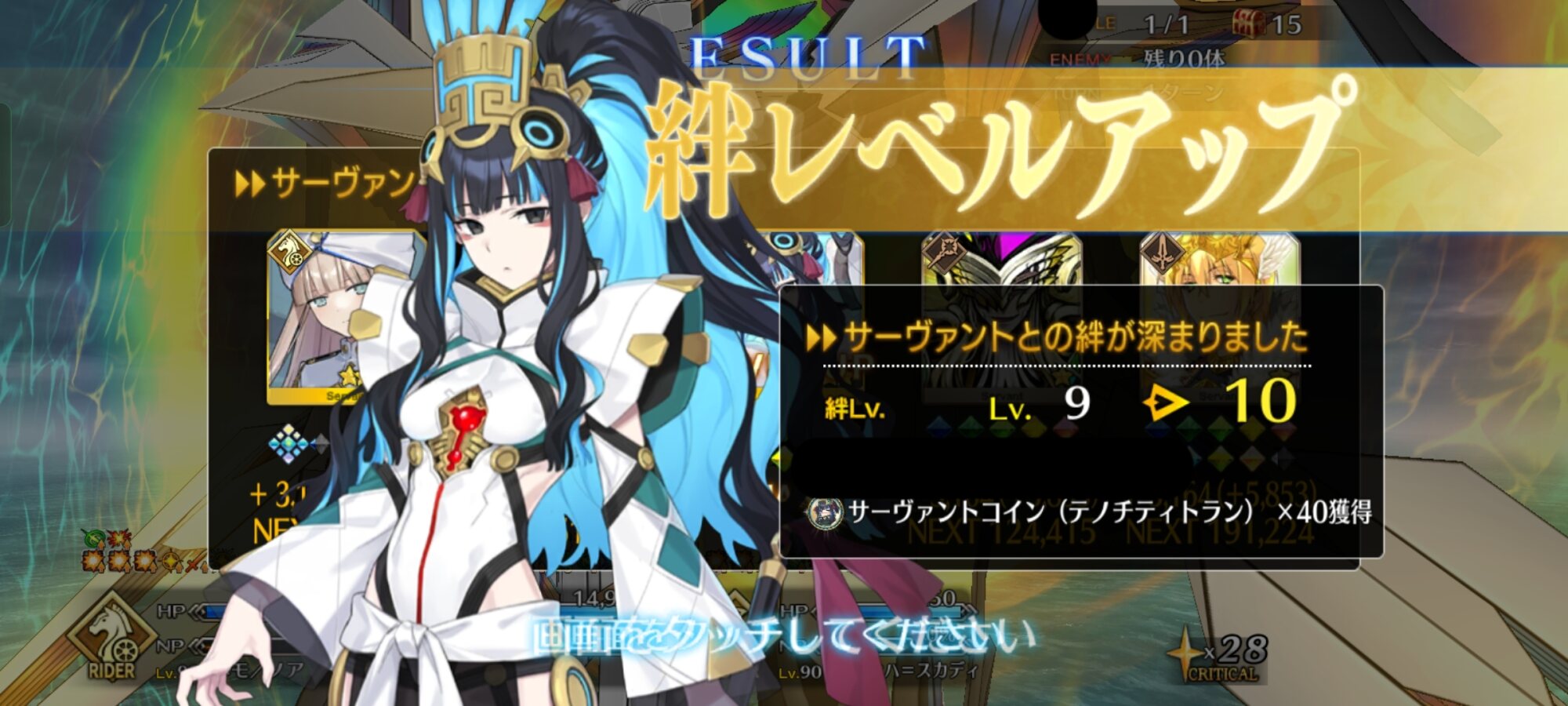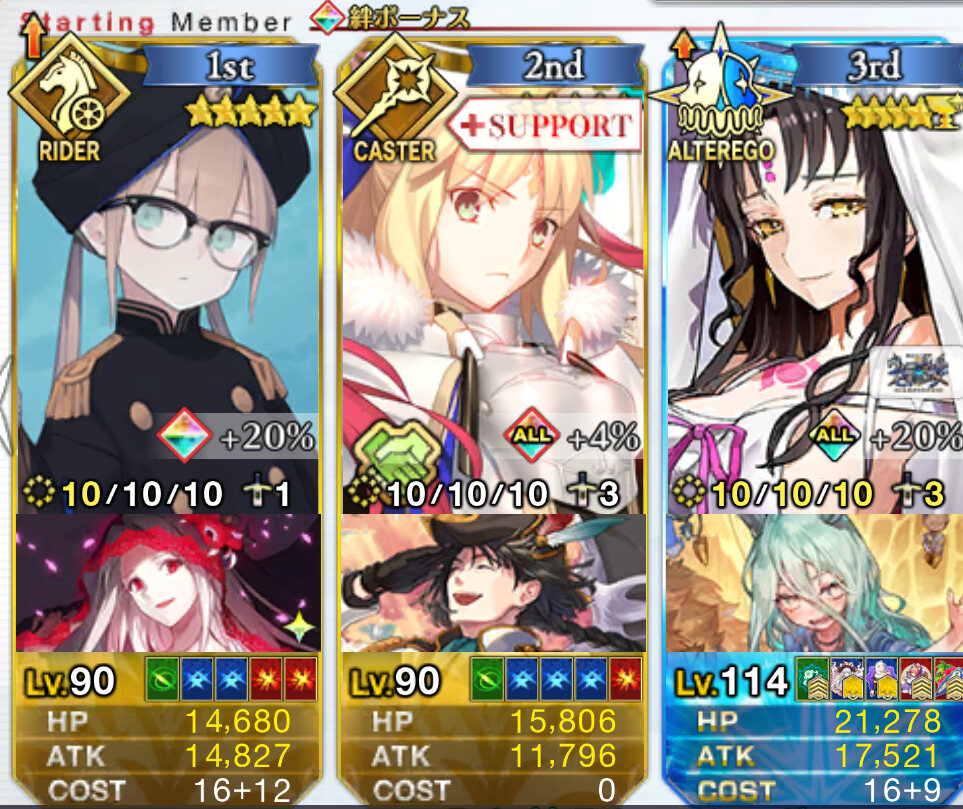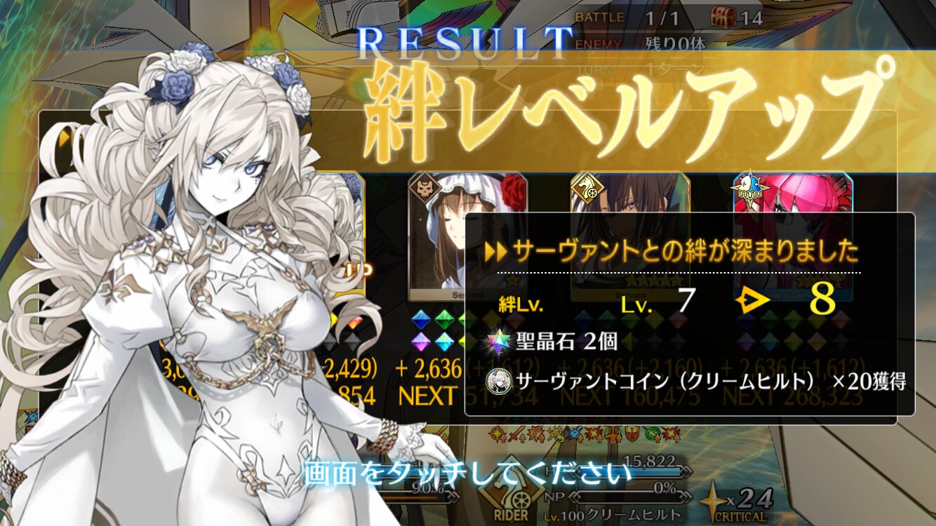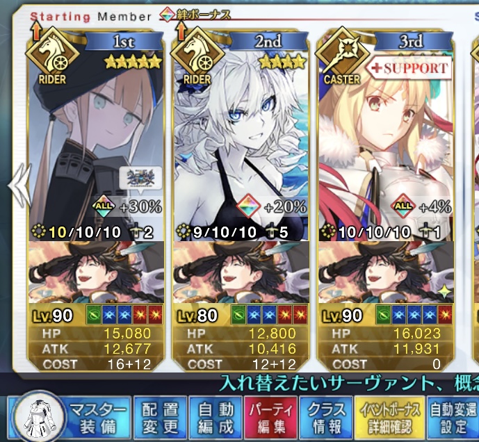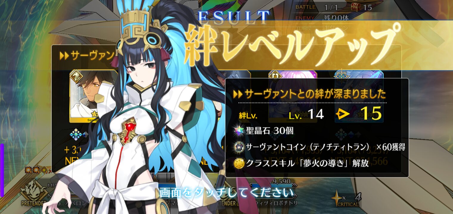 ライダースコア開けてる分もあるかもしれないが、次の戴冠戦がライダーですぐ来るし、問題ないな。サポに入れたテノチの絆がお茶と礼装効果でめっちゃあがっていく・・・。