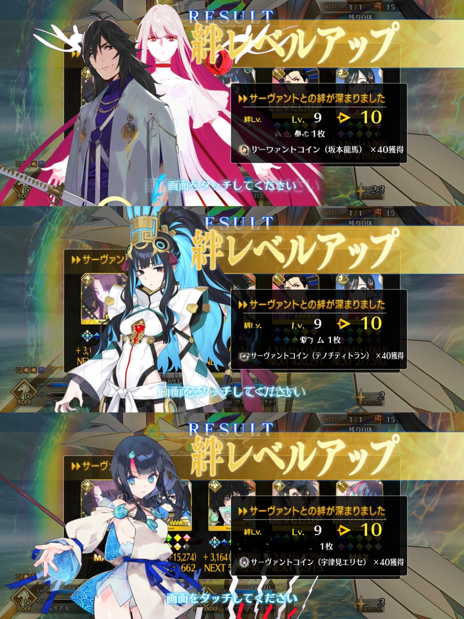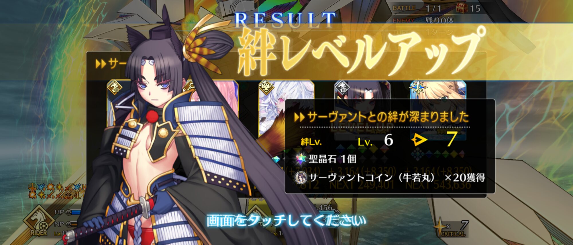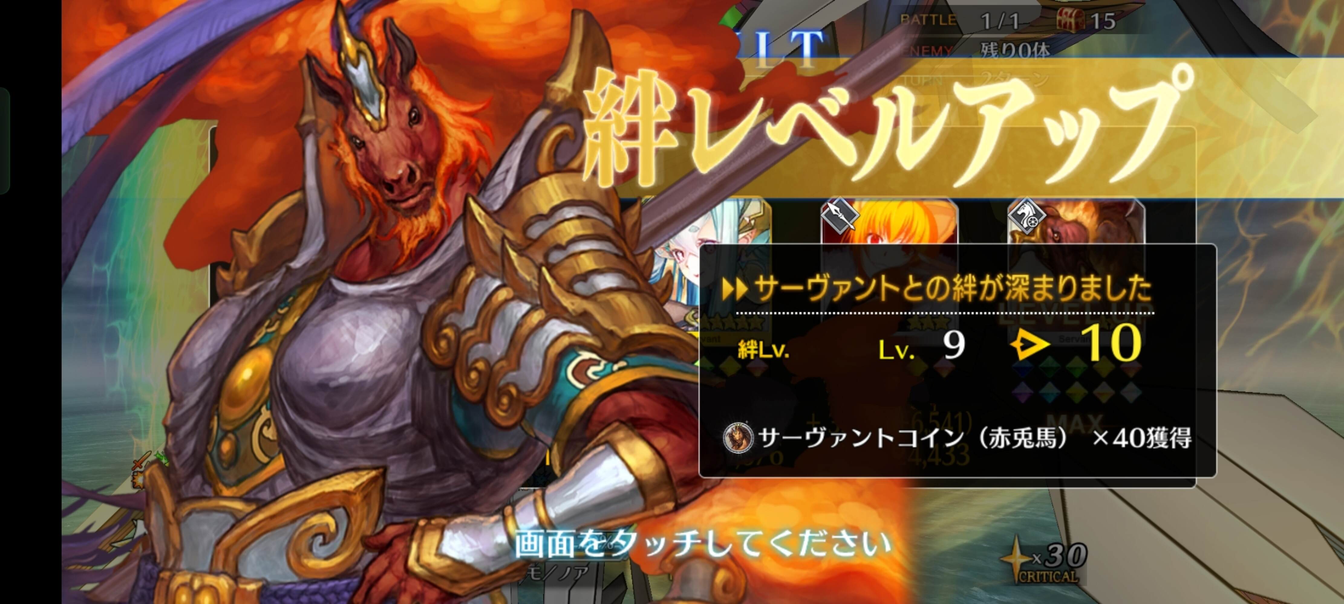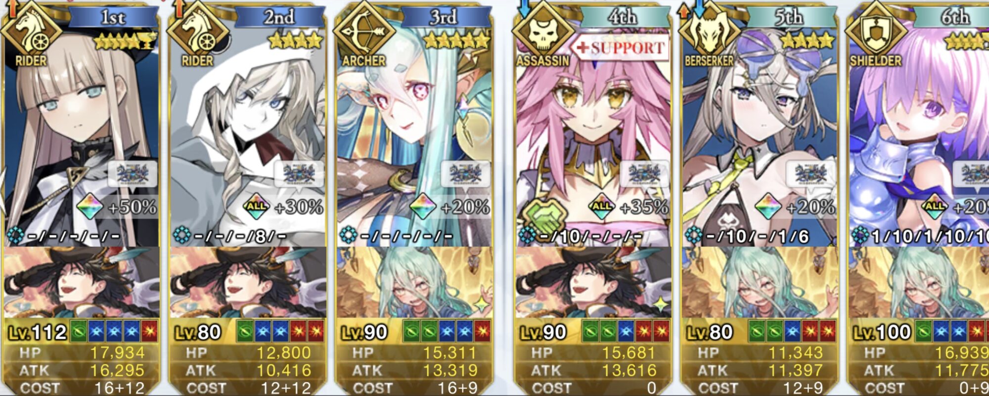 ライダースコア開けてる分もあるかもしれないが、次の戴冠戦がライダーですぐ来るし、問題ないな。サポに入れたテノチの絆がお茶と礼装効果でめっちゃあがっていく・・・。