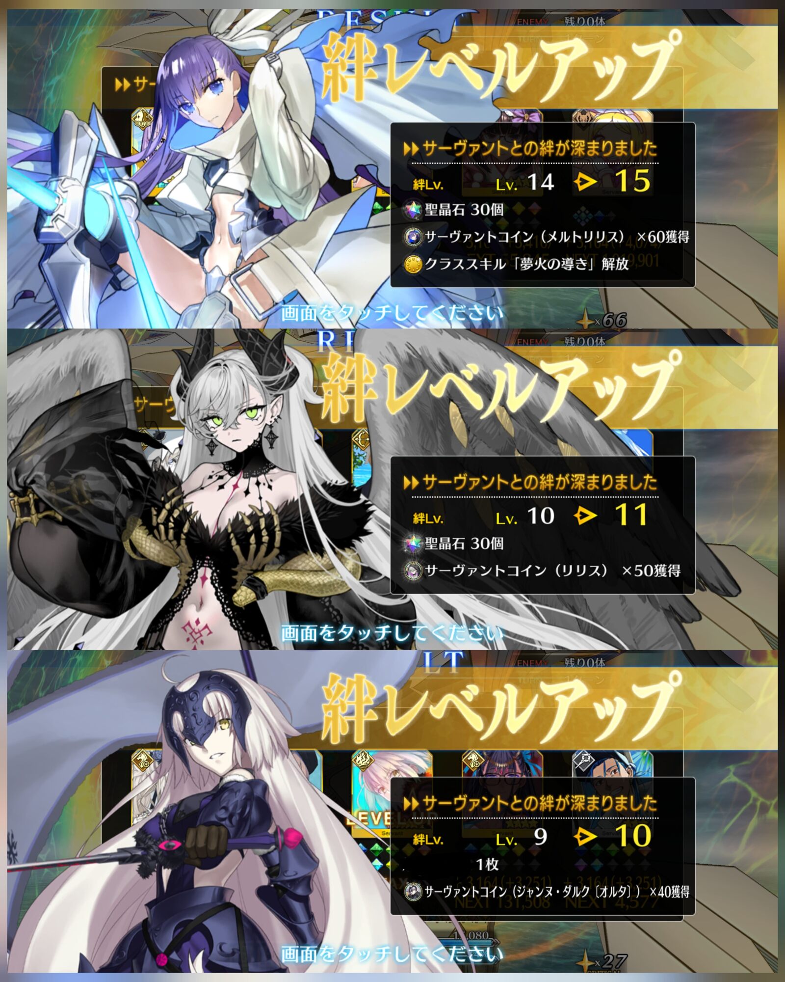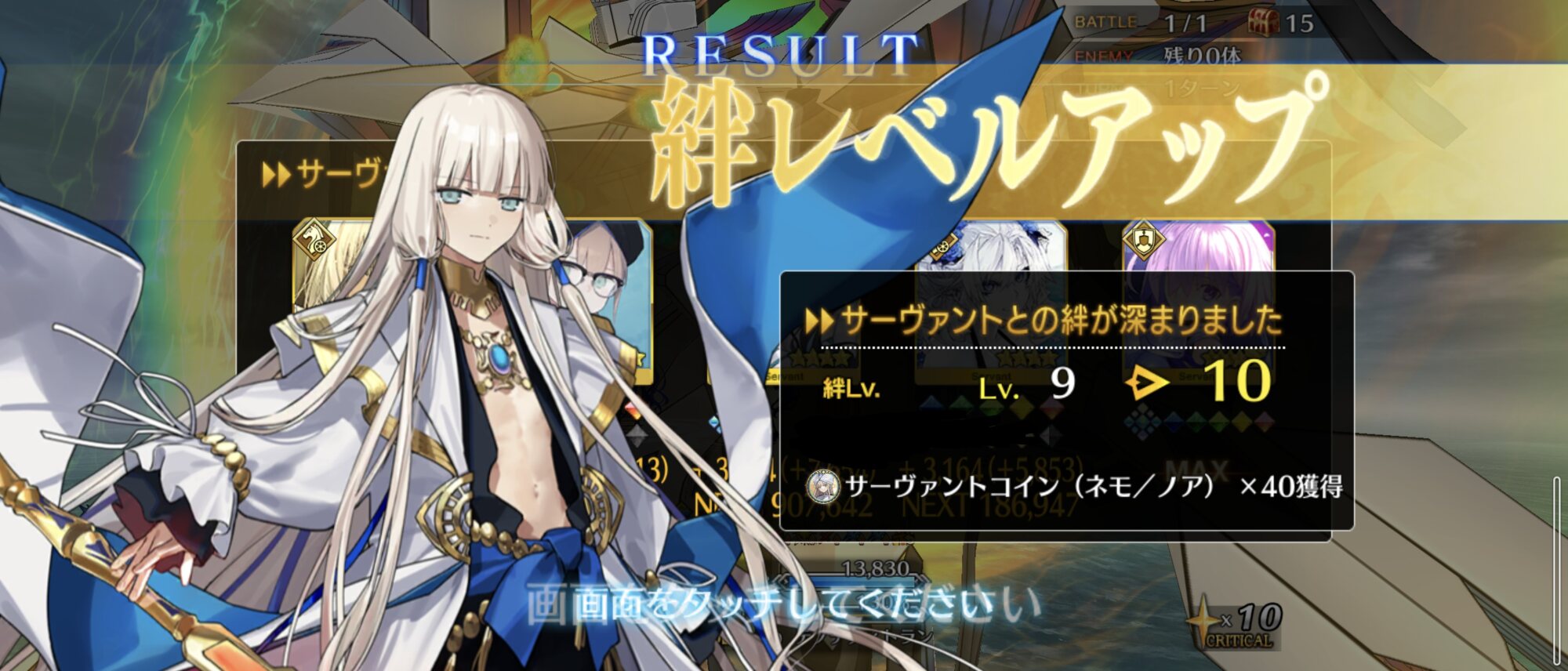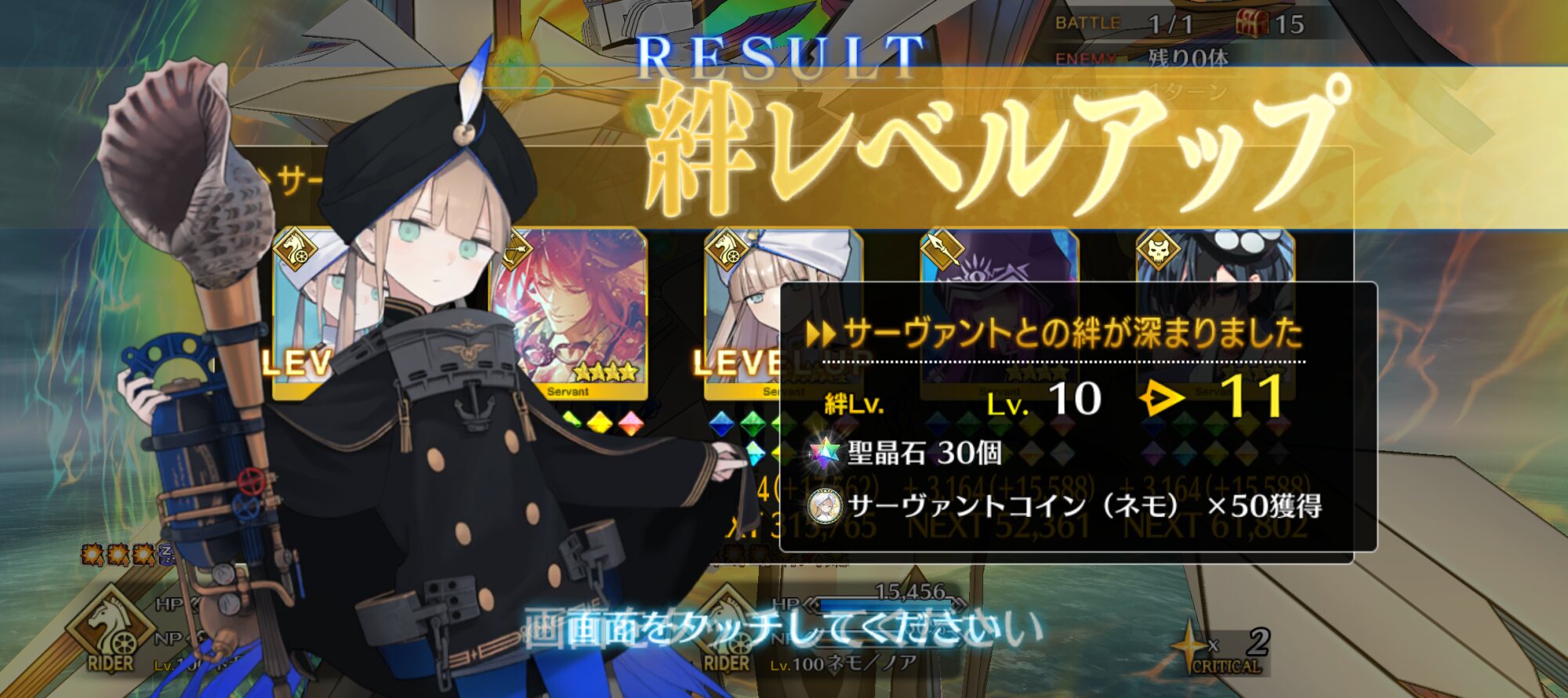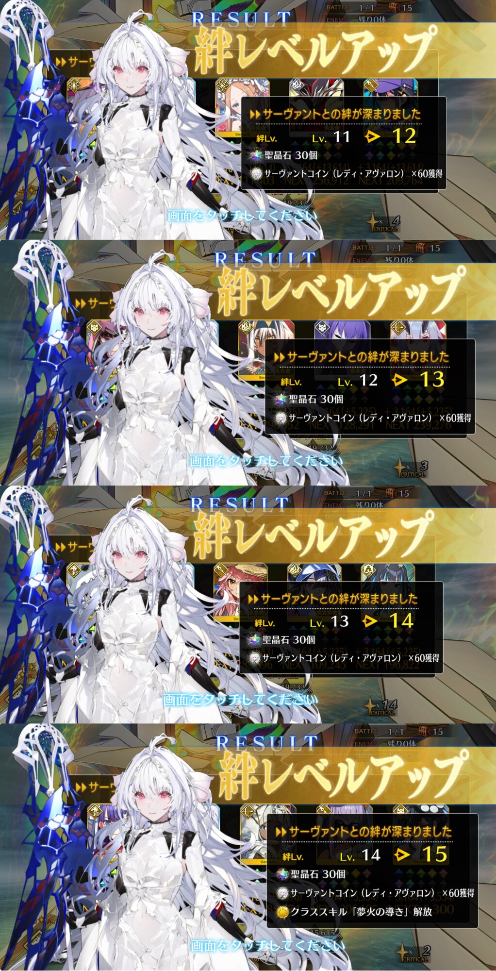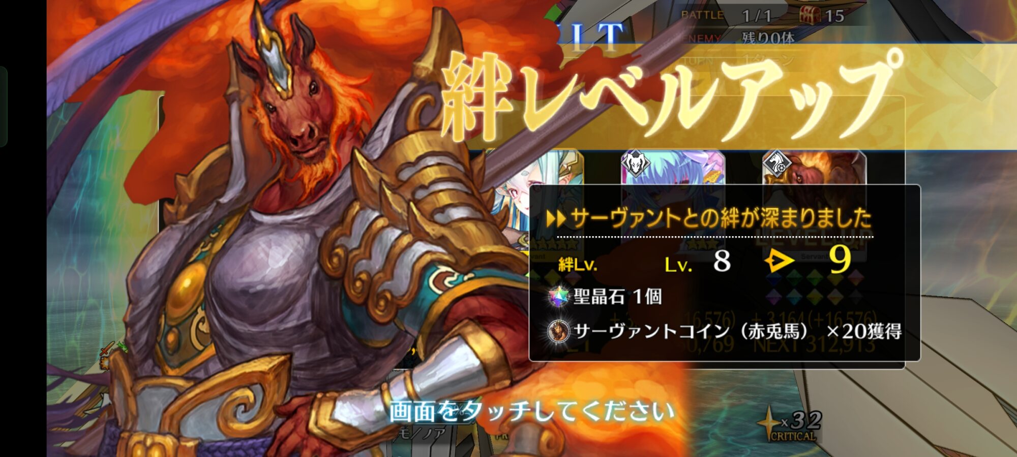 ライダースコア開けてる分もあるかもしれないが、次の戴冠戦がライダーですぐ来るし、問題ないな。サポに入れたテノチの絆がお茶と礼装効果でめっちゃあがっていく・・・。