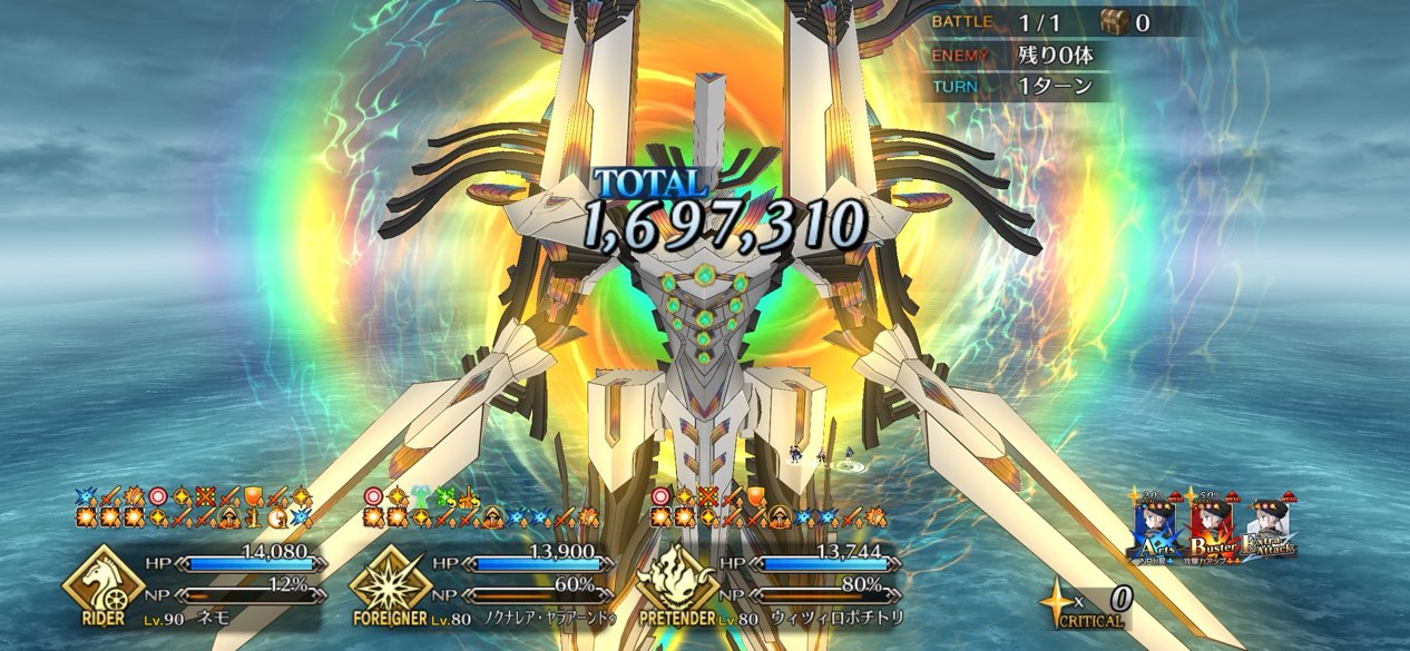 やっぱり神性はあるよねえイベ礼装なしだけど、ジュネス、ネモ、テノチ、フレンドキャストリアでネモの宝具だけで行ける。よっしゃ