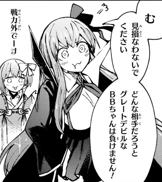 自分でチート系後輩名乗るだけあって実際ゲーム的にも強いよねBBちゃん、取り回しがいい上におまけ効果まである回復に大抵通せるスタンにこっちもおまけ付きのアーツバフとクリバフと使いやすいスキルが揃ってる上回転率のいい宝具でNPどんどん配れるし>>9