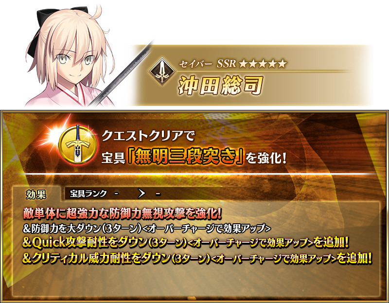 沖田さん、念願の宝具強化本当におめでとぉぉぉぉぉぉお!!!!だいすきだよぉぉぉぉお!!!!攻撃後ということは、沖田さんの攻撃後に誰かで急所を攻撃する前提か