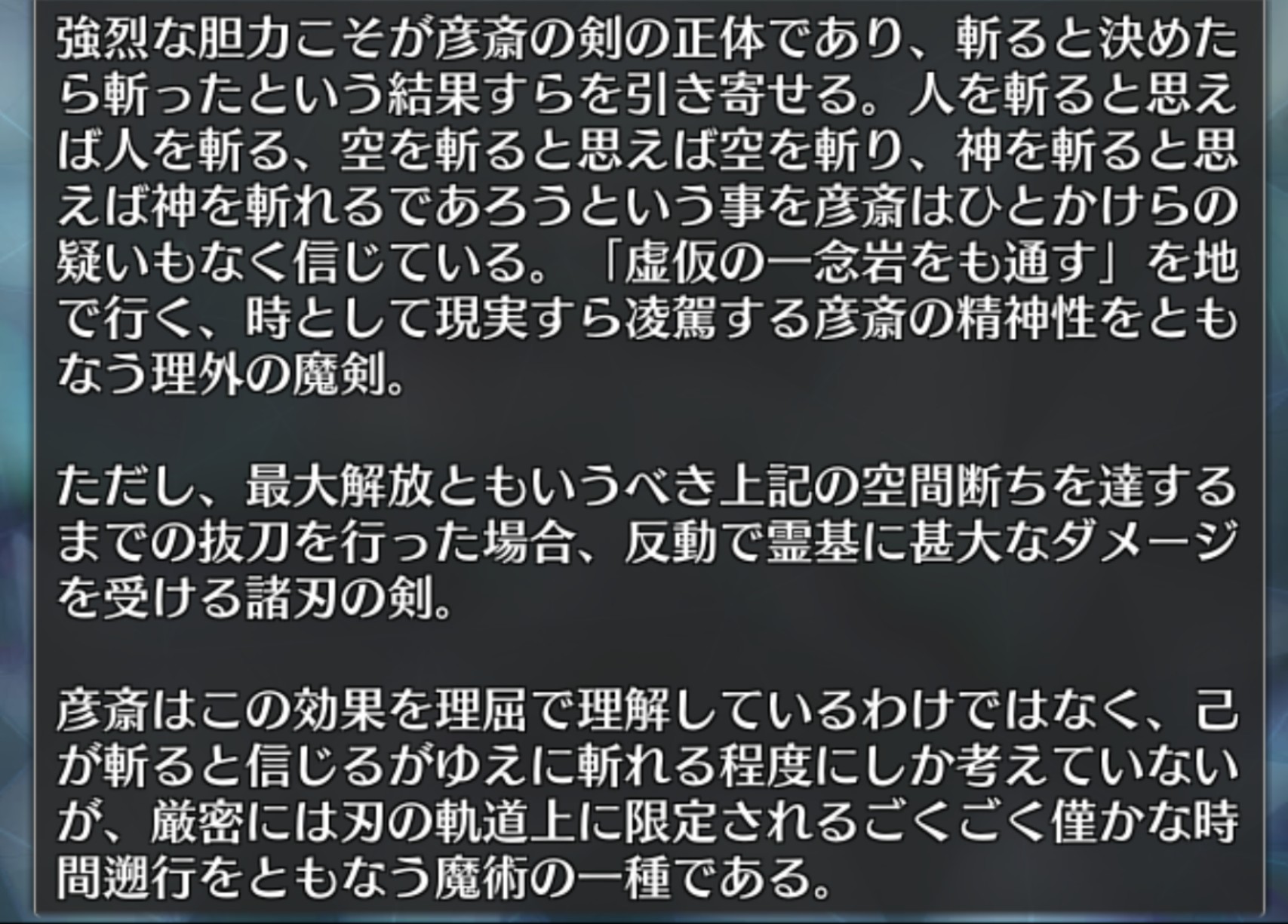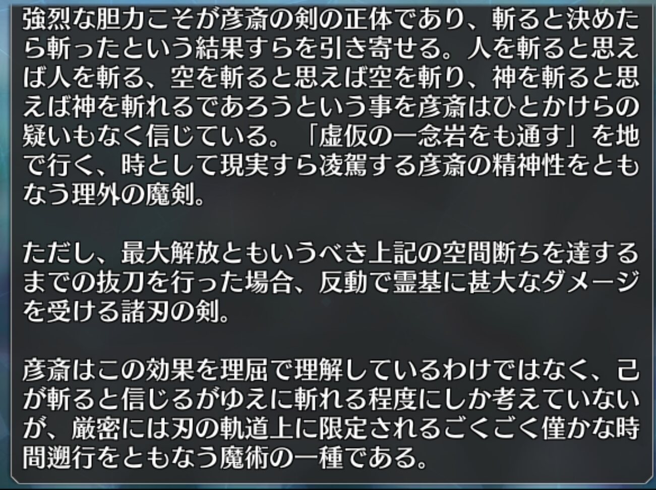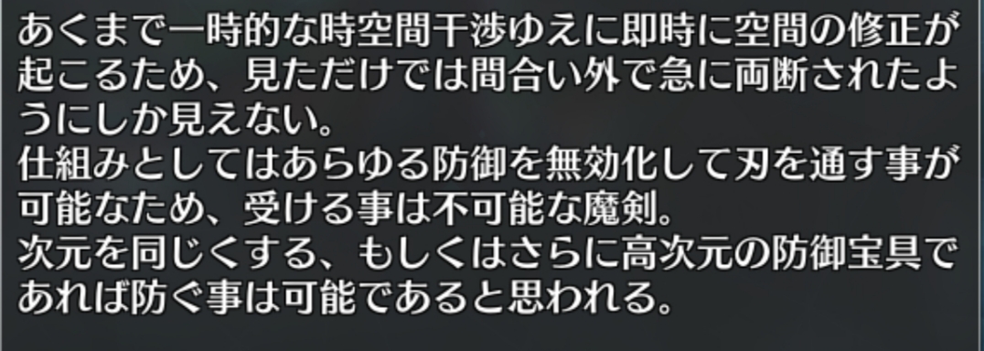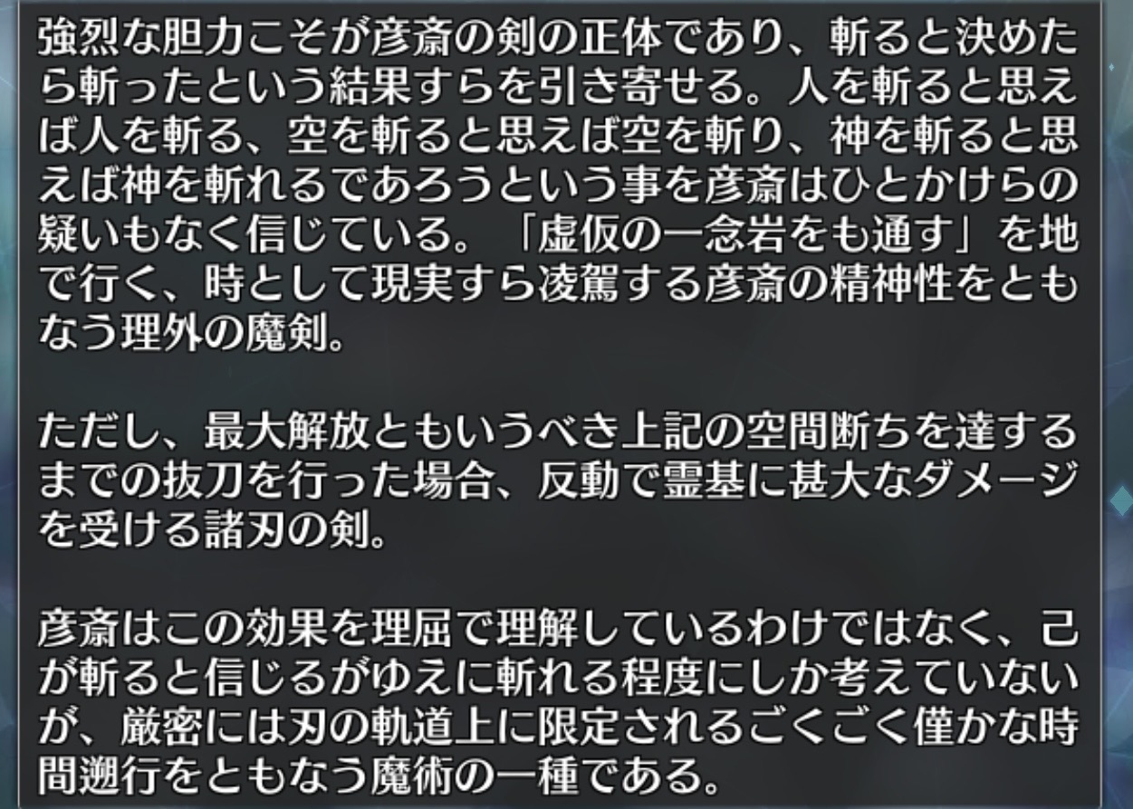 真面目に考察すると、対人魔剣の連続攻撃は相手が一人ならば極めて強い対人宝具だけど、対複数戦や対神代魔術使いや大型魔獣などにはそれほどでもない、まさに弱小人斬りサークル的なバランス。