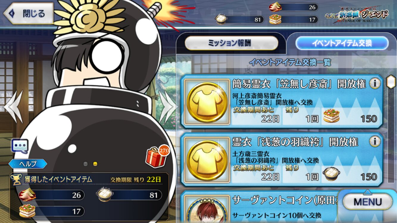 期間限定イベント「幕末チャンバラ神話 ぐだぐだ新選組・ジ・エンド REVENGE OF MAKOTO」の専用スレッドです。