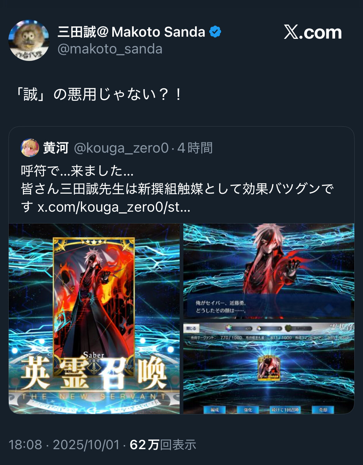 特にぐだぐだイベントとは関係の無い三田誠先生の「誠」に肖って、三田先生の執筆された作品を触媒としてガチャを回すこと
